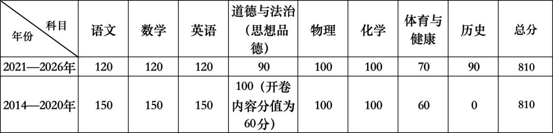 与广州当时原有的中考政策相比,2021年至2023年应用的广州中考新政增加了历史科目,分值为90分。同时,广州按照文理兼顾的原则,对录取计分科目的分值进行了调整。语文、数学、英语三科分值调整至各为120分;道德与法治分值调整为90分。物理和化学分值不变,各为100分。体育与健康分值提高到70分。录取计分科目总分仍保持810分。