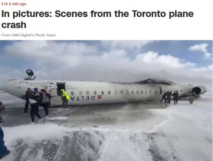 从现场视频来看,飞机翻了个底朝天,机腹朝上,现场有浓烟冒起。事故原因初步认为是恶劣天气,多伦多当天受到强风侵袭。