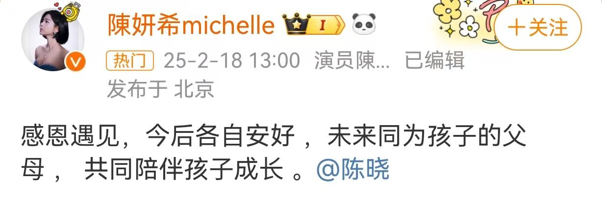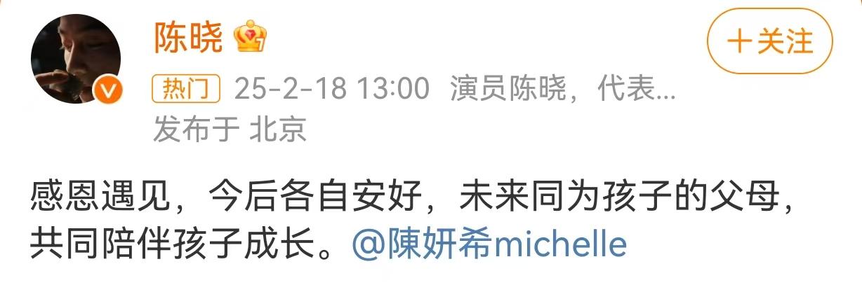 2月18日,演员陈晓和陈妍希在社交平台发文宣布离婚:“感恩遇见,今后各自安好,未来同为孩子的父母,共同陪伴孩子成长。”