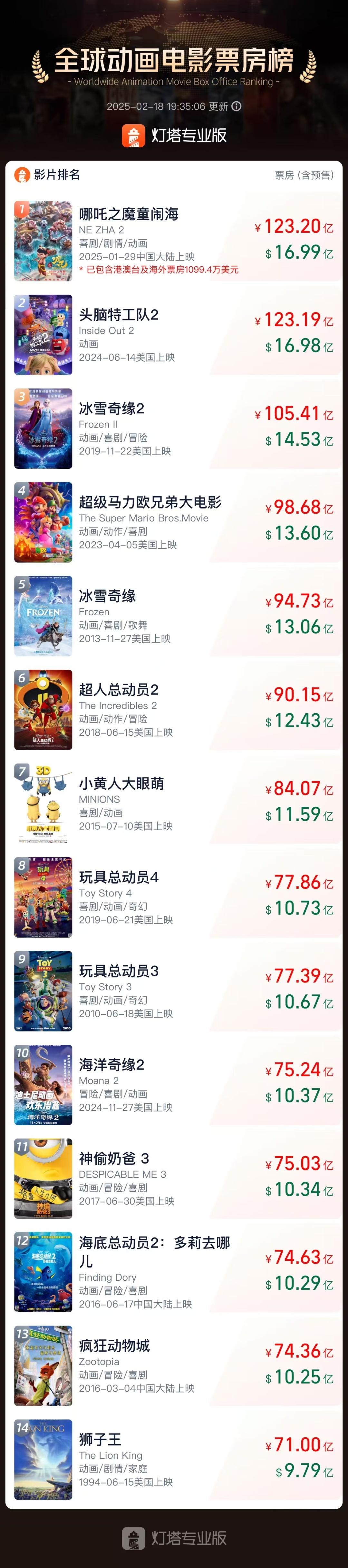 2月18日19:35,《哪吒之魔童闹海》总票房(含预售及海外)突破123.20亿元,超越2024年上映的《头脑特工队2》,登顶全球动画电影票房榜,并在全球影史票房榜上冲到第八位!