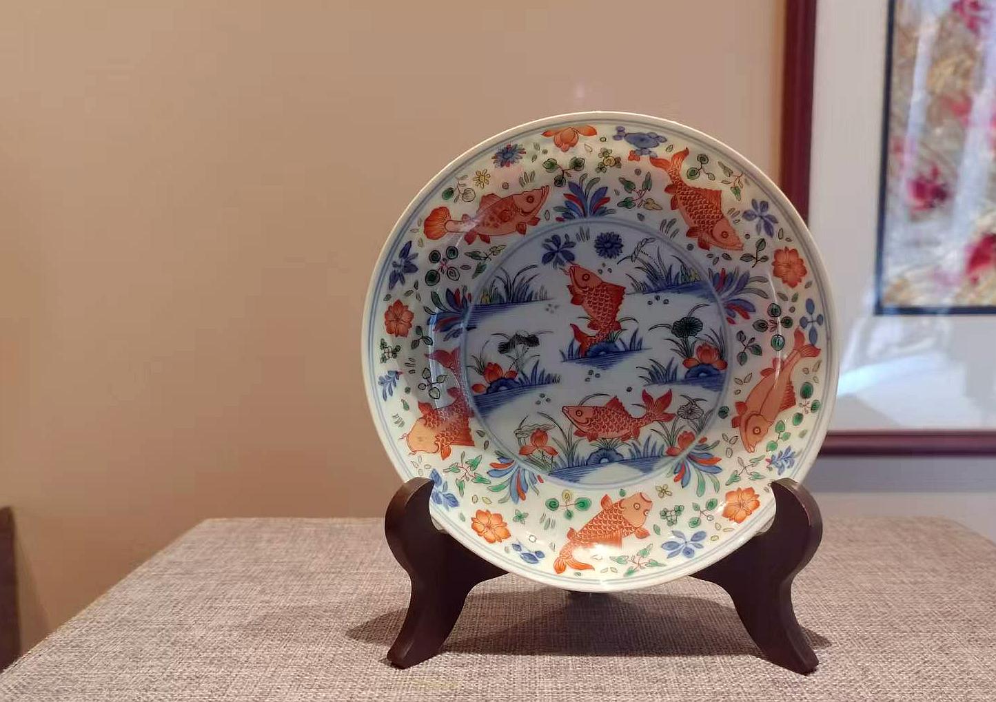 “在川知乐”款青花五彩鱼藻纹瓷碟