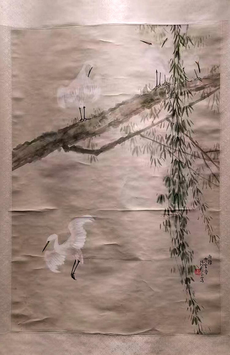 “春雨贵如油”,进入雨水时节,降水开始增多,植物感受到自然节律的召唤,开始吐芽、萌生。“千里天然微笑处——纪念陈树人诞辰一百四十周年展”中陈树人的一件作于1947年春的《雨后》便是描绘了春雨带来的欢欣之感。画面中柳叶翠绿,一只白鹭休憩于枝头,另一只刚刚扑扇着翅膀飞开,生趣盎然。