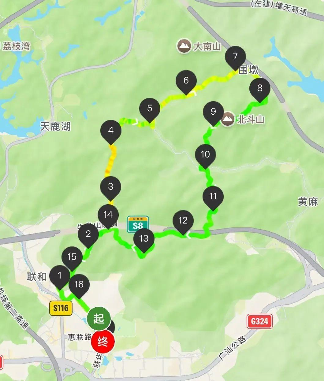 牛头山大环线以黄陂地铁站为起点,一路上经过乌石山、黄草排山、八哥村、北斗山、木强水库尾、大南山、牛头山、天鹿湖公园等地,全程约20公里,属于挑战级别的徒步线路。