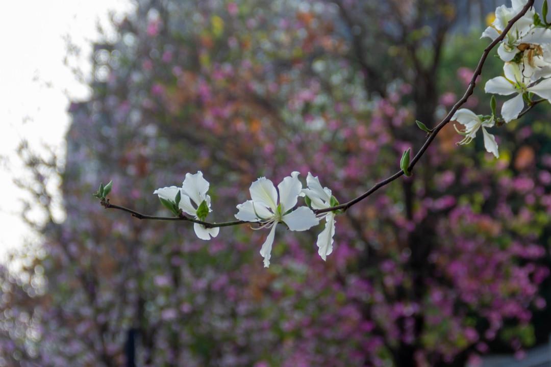 穿行在云城西路、云城东路、齐心路、云城中一路、广云路、白云大道北等路段,随处可见宫粉紫荆的倩影。它们或白如雪,或粉似霞,在春风中时而摇曳生姿,时而落英缤纷,美不胜收。