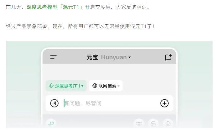 2月19日晚,腾讯元宝正式官宣旗下深度思考模型“混元T1”现在面向所有用户无限量开放使用,且混元与DeepSeek两大模型均免费无限量使用。这一举措,标志着用户将迎来更自由、更强大的AI交互体验。