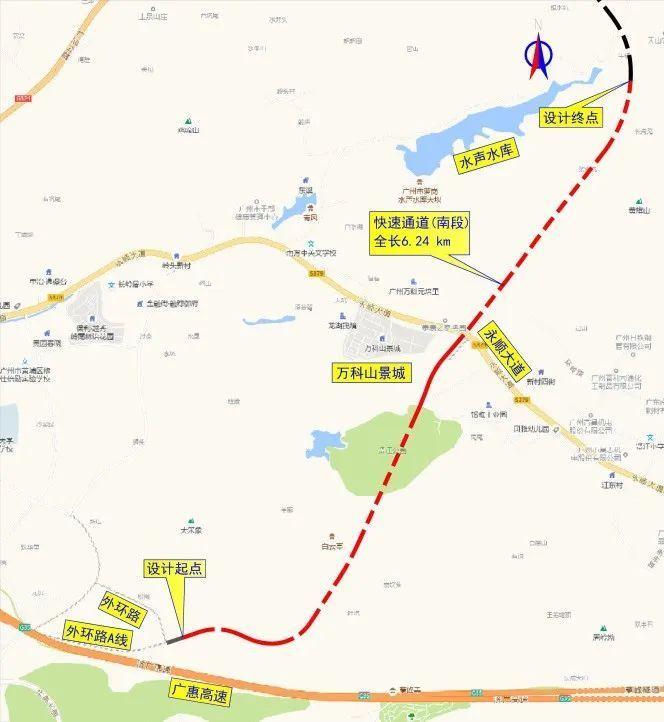项目全长13.5公里,起于外环路与A线交叉口。路线往东北行进,设置隧道穿越大峒岭山,沿长岭居规划三路线位行进,并上跨田园路、永顺大道、岭头路,往北设置隧道穿越黄旗山,经水声水库北侧穿越油麻山片区,终点跨越广汕公路及花莞高速后,主线接入生物安全园区范围永九快速。