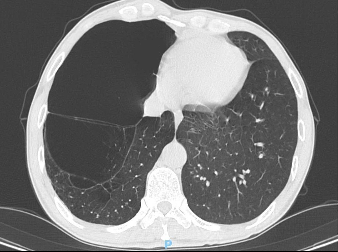 据介绍,肺气肿多见于慢阻肺患者中,如果同时并发肺大泡,肺组织进一步受到肺大泡挤占,患者常常伴随着严重呼吸困难。考虑到患者肺功能状态很差,憋喘较重,当务之急是要想办法切除这个肺大泡,否则可能危及生命。