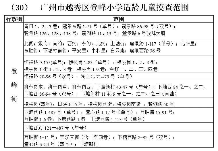 请家长携带相关资料,按学校规定时间前往登峰小学下塘校区(地址:广州市越秀区下塘新村55号)办理适龄儿童入学摸查登记。