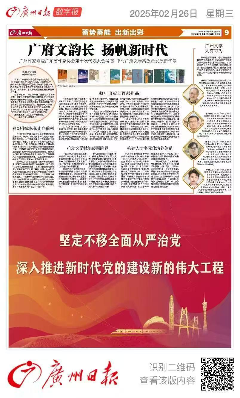 “临江喧万井,立地涌千艘。气脉雄如此,由来是广州。”赓续千年城脉、文脉、商脉,广州作家正在奋力打造一个文学新高地。乘着广东省作协第十次代表大会的东风,广州作家将持续深入生活、扎根人民,坚持用手中之笔讲好广州故事,呈现一个老与新、快与慢、远与近的“文学广州”,积极推动实力作家和高质量文学作品走向全国,走向世界。
