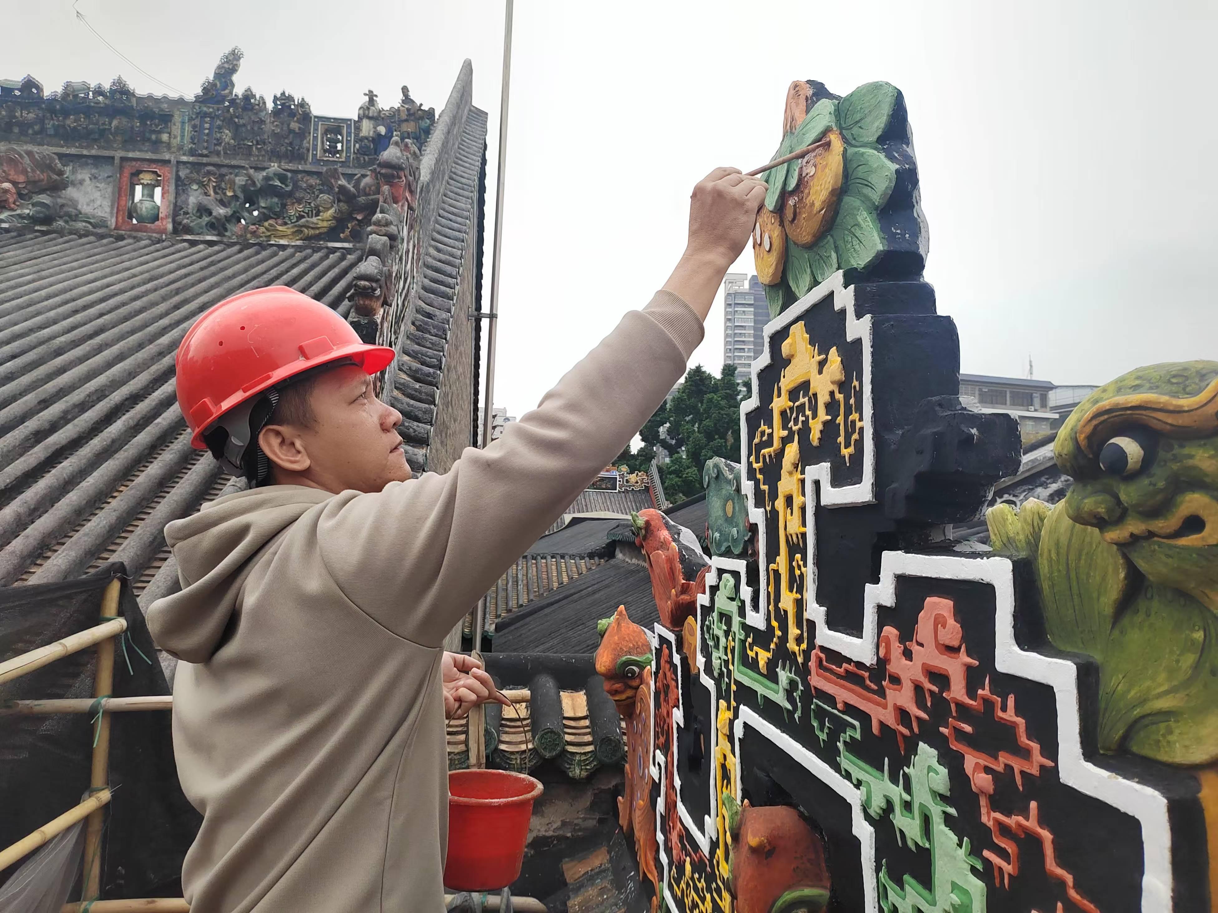 2月底,广州陈家祠后西厢房的屋顶上,广州灰塑市级代表性传承人欧阳可朗熟练地给面前的灰塑上着色,“上完这遍色,就差不多了。最近天气还可以,不太晒也不太湿,是做灰塑的好时机。”