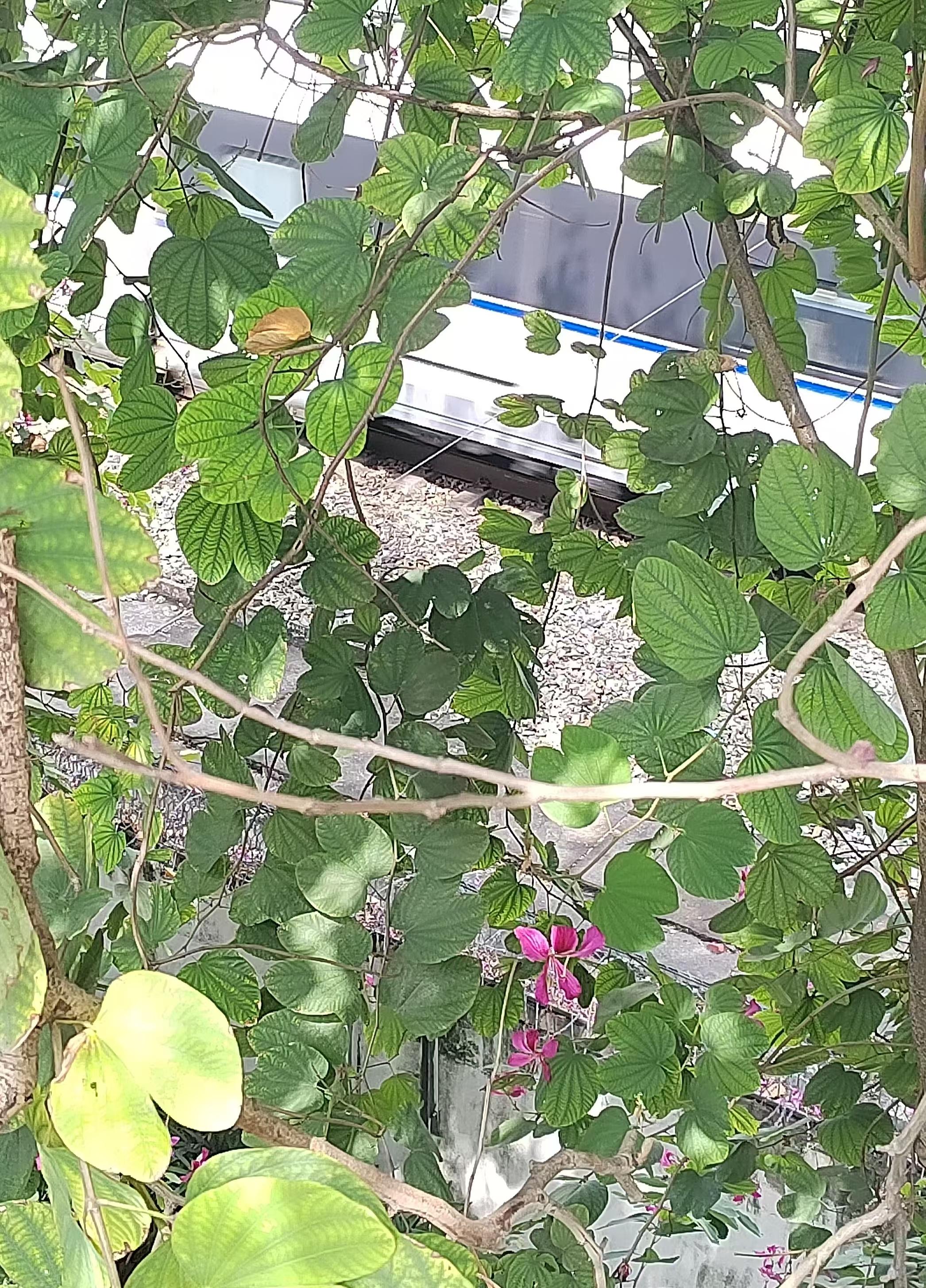 花叶间,动车洁白的身影一瞬而过