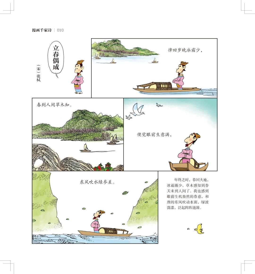 千家诗是流传甚广、影响深远的启蒙诗选,所录篇目多为唐宋时期的名家名篇,题材丰富,包括山水田园、赠友送别、思乡怀人、吊古伤今、咏物题画、侍宴应制等,多为五言、七言绝句和律诗,文字易于成诵,非常适合学习中国古典文学之用。蔡志忠将诗句化成图画,通过生动活泼的漫画形象和场景表现了千家诗的意境,刻画了千家诗所反映的社会风貌。漫画与千家诗,诗画成趣,以现代视角探究文化底蕴,让现代读者轻松阅读中国传统文学经典。
