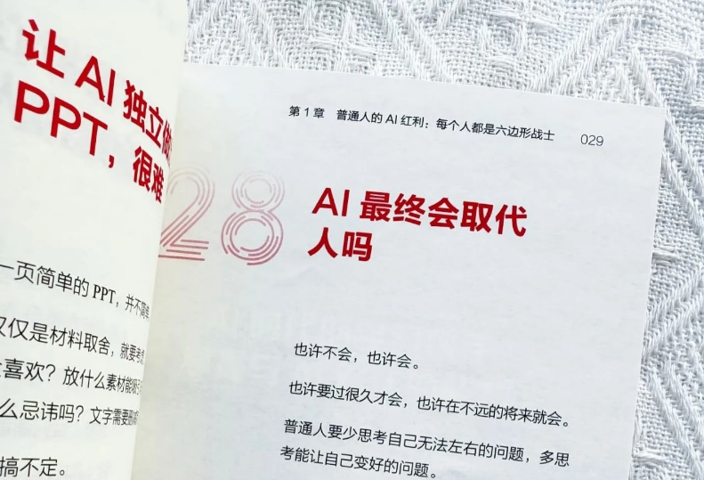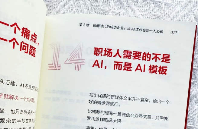 书中提出两大核心观点:首先是AI红利并非普惠资源,而是属于两类人——率先拥抱技术者与深度应用者。他通过大量案例拆解,揭示了如何通过优化提问方式、重构思维模式,将AI转化为个人与企业的“战斗力”;其次是指明颠覆性行动框架:全书以“每一页都是行动清单”为特色,从思维颠覆到实操路径层层递进。例如,书中提出“人机协同”的五大策略,涵盖决策优化、效率提升、创意激发、产品升级等维度,直击传统行业转型痛点。