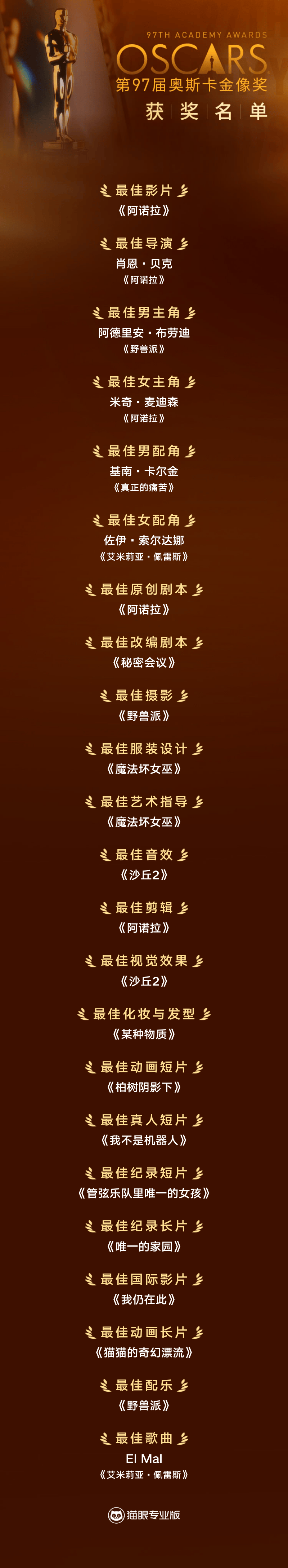 刚刚,第97届奥斯卡金像奖获奖名单公布!《阿诺拉》获最佳影片奖,肖恩·贝克获最佳导演奖,阿德里安·布劳迪、米奇·麦迪森分获最佳男女主角奖。