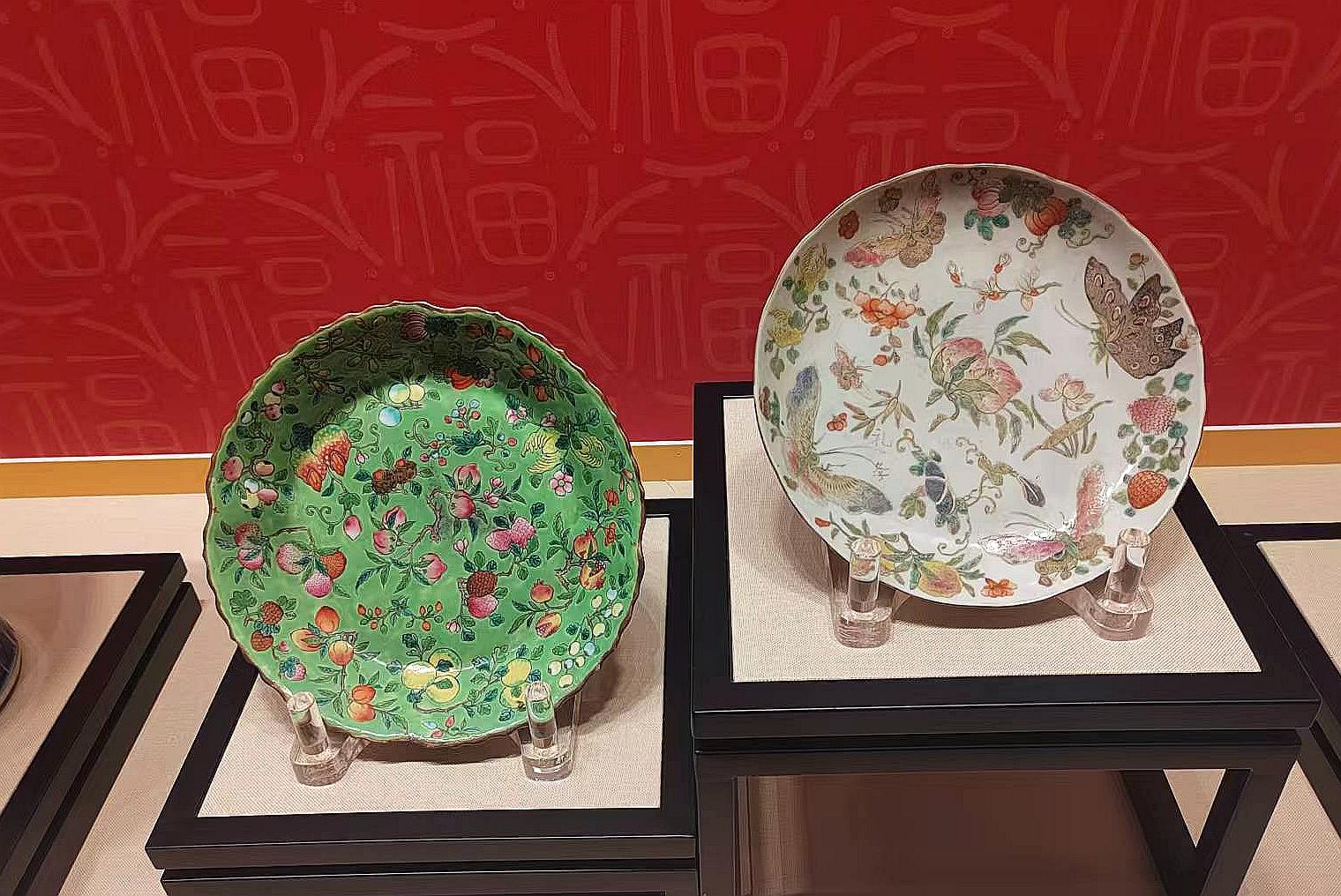 “绿地粉彩花果纹花口瓷盘”(左)、“粉彩花果蝶纹瓷盘”