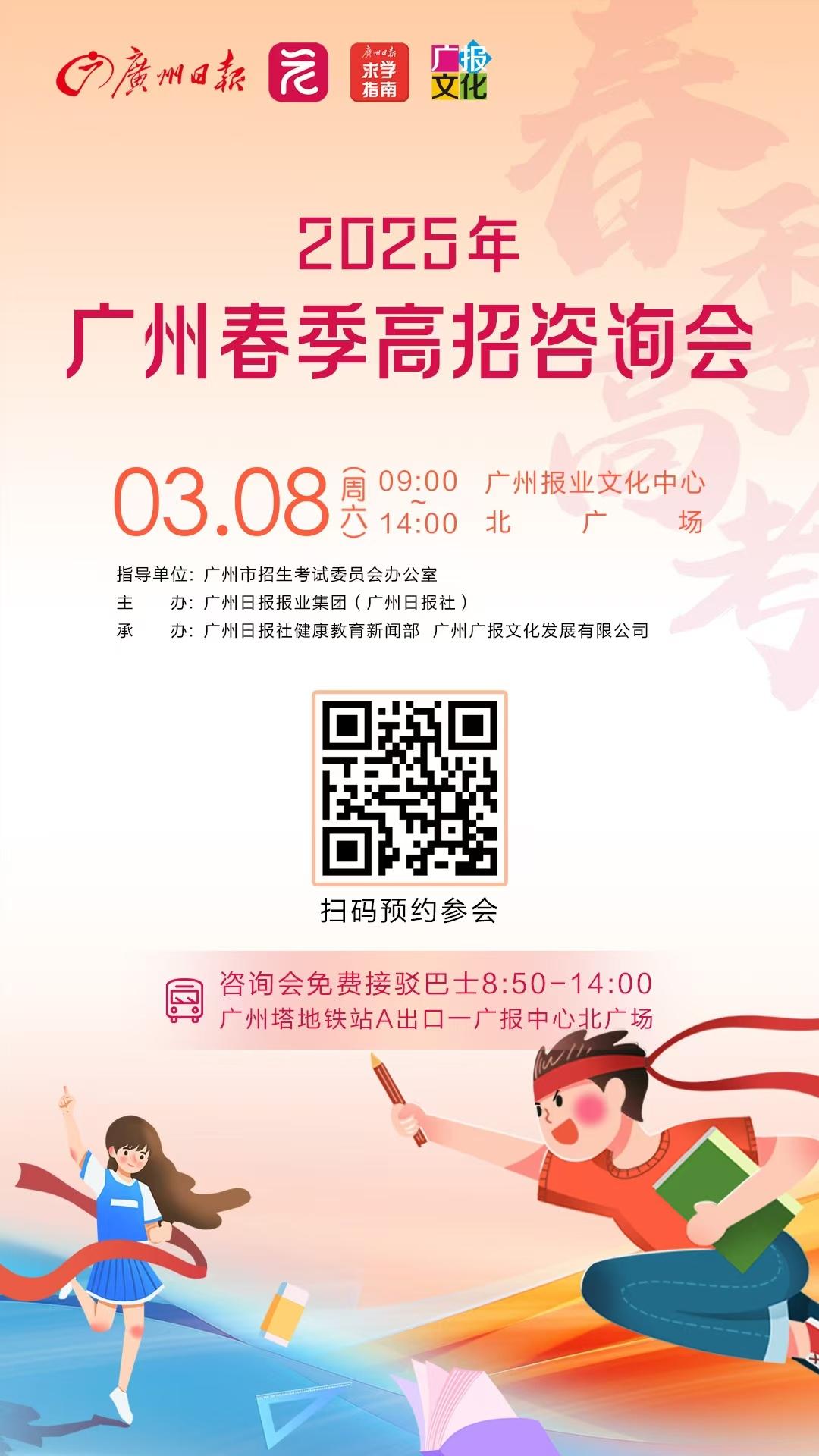 2025年广州春季高招咨询会由广州市招生考试委员会办公室指导,广州日报报业集团(广州日报社)主办,广州日报求学指南工作室、广州广报文化发展有限公司承办。