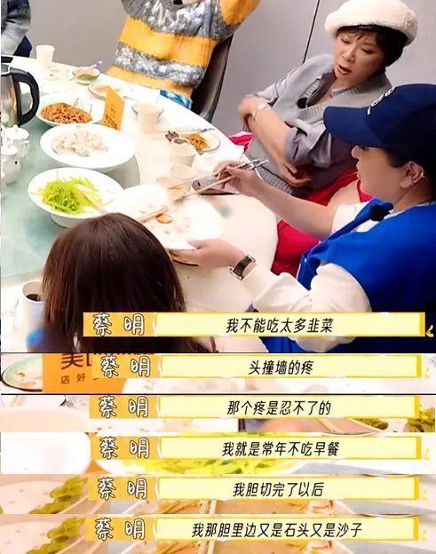 蔡明坦言胆结石发作时“疼得想撞墙”,她说:“胆结石在胆里待着就没事,一旦你一晃,那石头就卡在胆管里了,头撞墙的疼,那个疼是忍不了的,太疼了。”“切了胆之后,那个胆里又是石头又是沙子。”