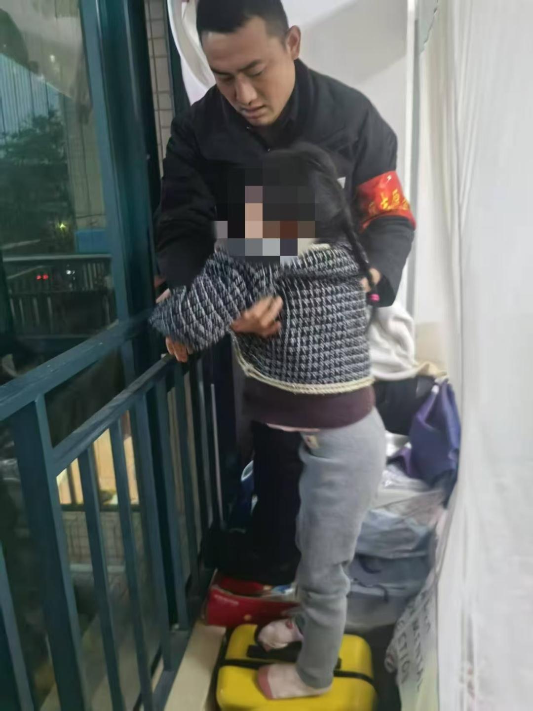 当值班长和消防班长飞奔至小女孩家门口。由于防盗门已被反锁,小女孩母亲虽已回到小区,但无法用钥匙打开家门。在征得小女孩母亲同意后,他们果断使用消防斧头砍掉门锁,入屋后迅速跑到小女孩爬出去的房间,与墙外的居民里应外合,顺利将孩子抱回屋内。