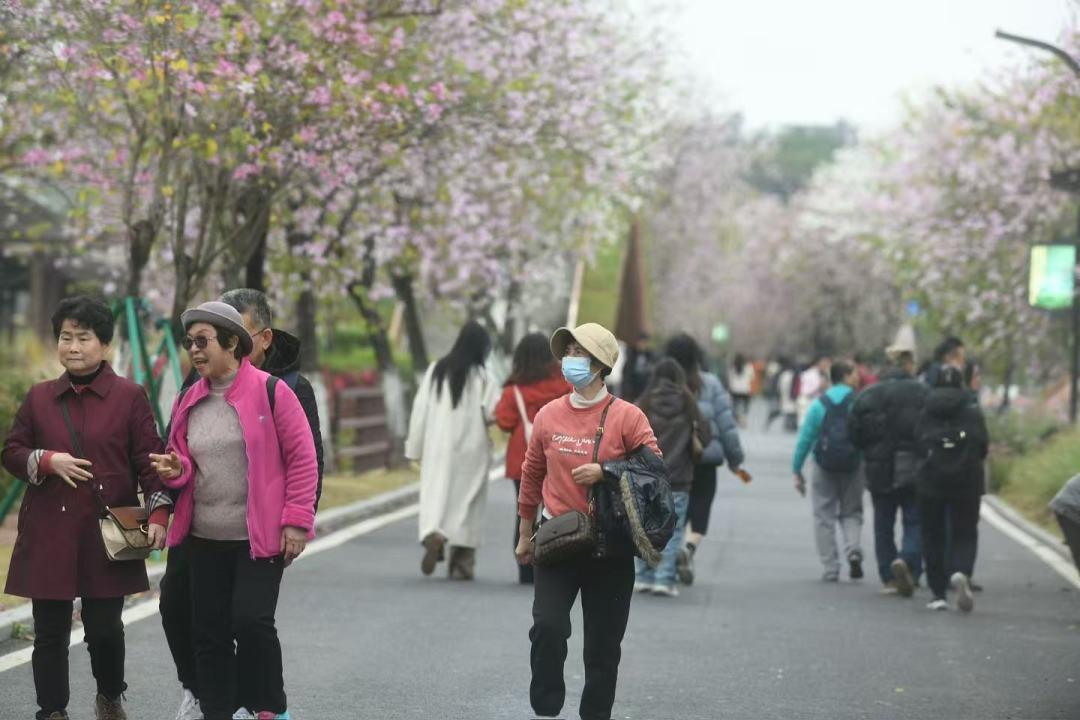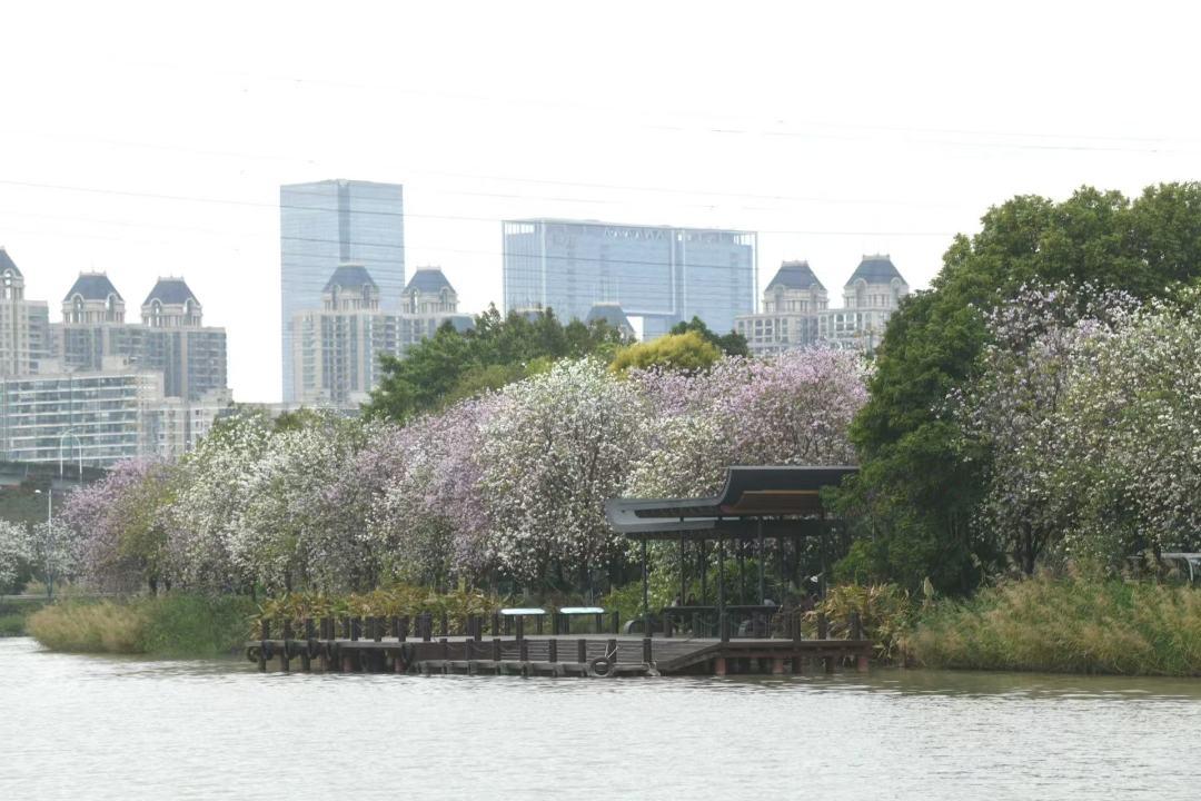 此外,湿地二期“樱花园”的广州樱、小乔樱等品种接力绽放,粉黛色花枝与水岸倒影相映成趣。