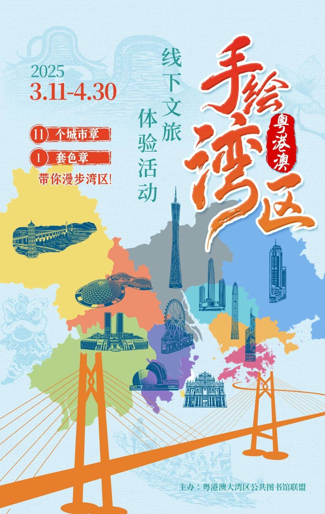 2025年2月28日,在“湾心璀璨·我们都是湾区人”报告会暨系列活动启动仪式上,广东省立中山图书馆首发“手绘湾区”套色章。3月11日,粤港澳大湾区公共图书馆联盟将联合广州、深圳、珠海等9市11馆(广东省立中山图书馆、 广州图书馆、深圳图书馆、珠海市图书馆 、 佛山市图书馆 、惠州市图书馆 、东莞图书馆 、 中山纪念图书馆 、江门市图书馆 、肇庆市图书馆、广州南沙区图书馆 ),正式启动“手绘湾区”线下文旅体验活动,用创意手绘印章串联湾区地标与文化脉络,邀请读者边打卡、边探索,开启一场穿越大湾区的纸上旅行,在方寸之间读懂湾区万象!