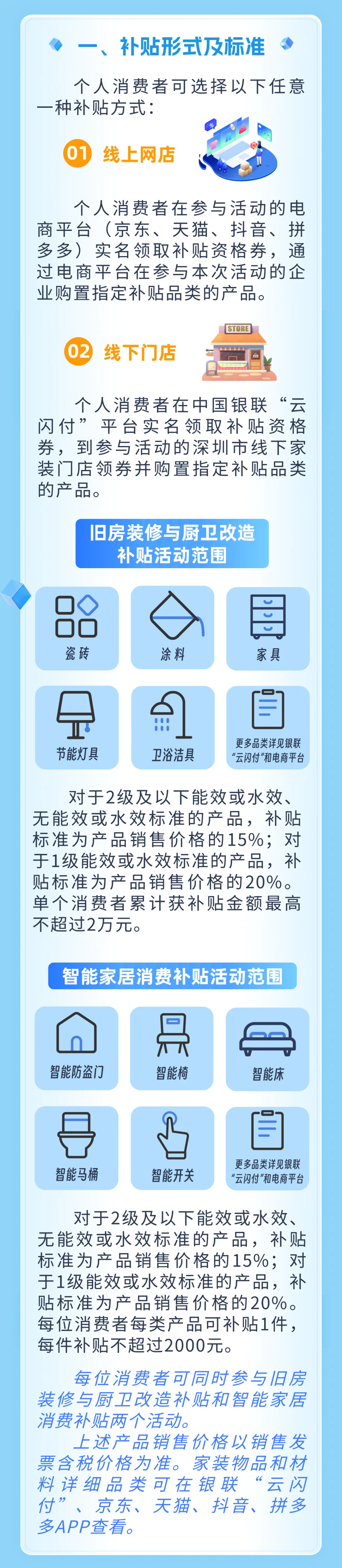 消费者可通过京东、天猫等电商平台(线上)或“云闪付”APP(线下)实名领取补贴资格。消费者可同时参与旧房装修与厨卫改造补贴只能二选一。如有相关问题,线上可咨询对应电商平台,线下可通过“云闪付”相关渠道或拨打门店商户电话咨询。操具体详细下图——