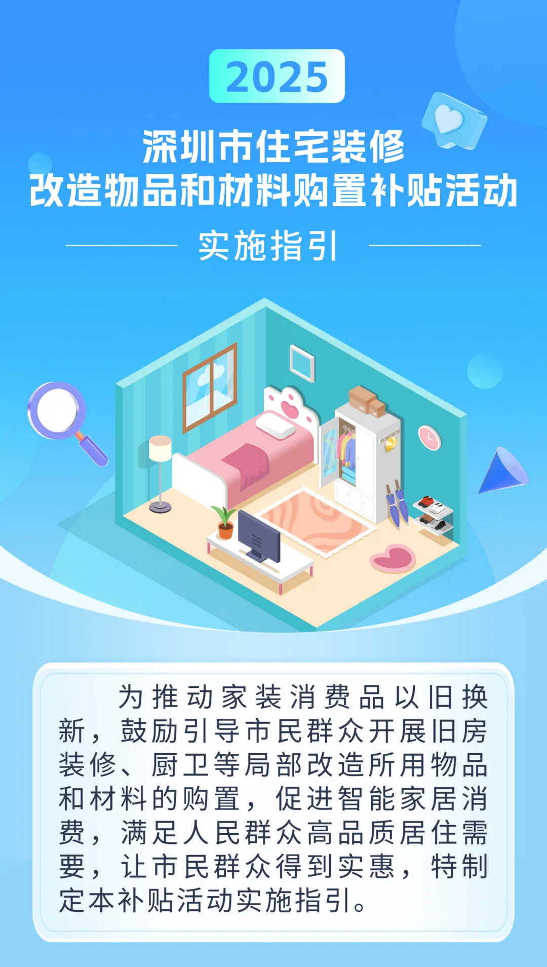近日,深圳市为推动家装消费品以旧换新,满足市民高品质居住需求,推出住宅装修改造物品和材料购置补贴活动。活动自2025年3月7日开始,受总额控制,先到先得。