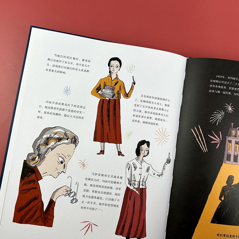 皮埃尔·居里早逝,玛丽·居里很早成为一名单身母亲,她与两个女儿的关系是她人生中很重要的一部分。玛丽的两个女儿性格迥异、人生选择截然不同:大女儿伊雷娜跟随玛丽走上科学之路;小女儿艾芙热爱文学艺术,选择成为作家。但她们都与母亲一样独立而坚定,充满热情地追求自己的梦想。两代人、三位女性不同的成长之路,为孩子提供了更多元的榜样选择。
