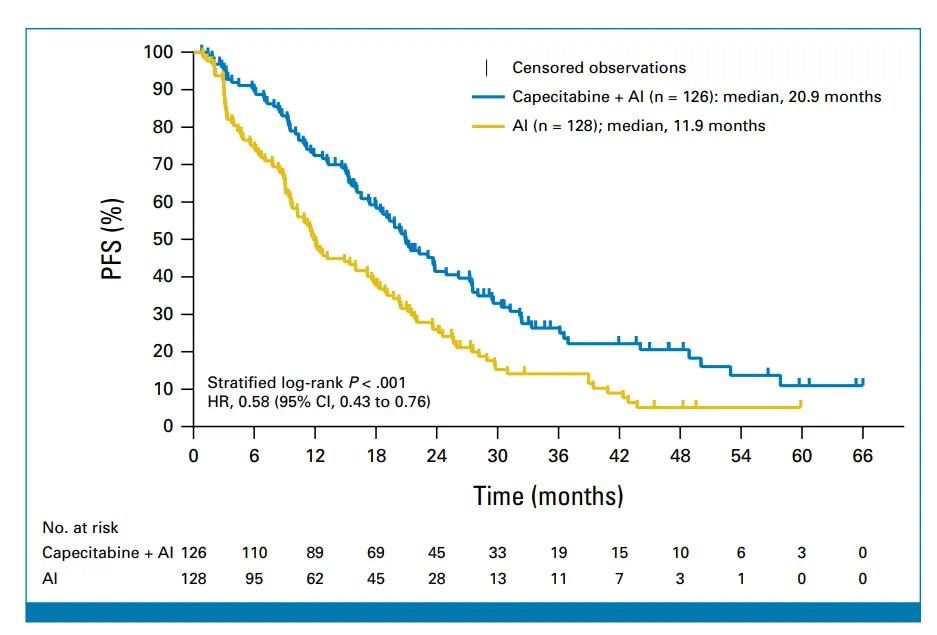 研究中254位患者,根据1:1的比例随机分配,一组接受节拍卡培他滨(每次500毫克,每日3次口服)与芳香化酶抑制剂联合治疗,另一组接受单独的芳香化酶抑制剂治疗。随访50.7个月后,联合治疗组的中位无进展生存期为20.9个月,显著优于内分泌单药治疗组的11.9个月。如今,联合治疗组的中位总生存期还未成熟,而内分泌单药治疗组的中位总生存期为45.1个月,相比单药组,联合组的疾病进展和死亡风险降低了42%。联合组的3年、5年生存率分别为79%、52%,而单药组则分别为63%、28%。而在疾病客观缓解率方面,联合组、单药组分别为37.3%和25%。