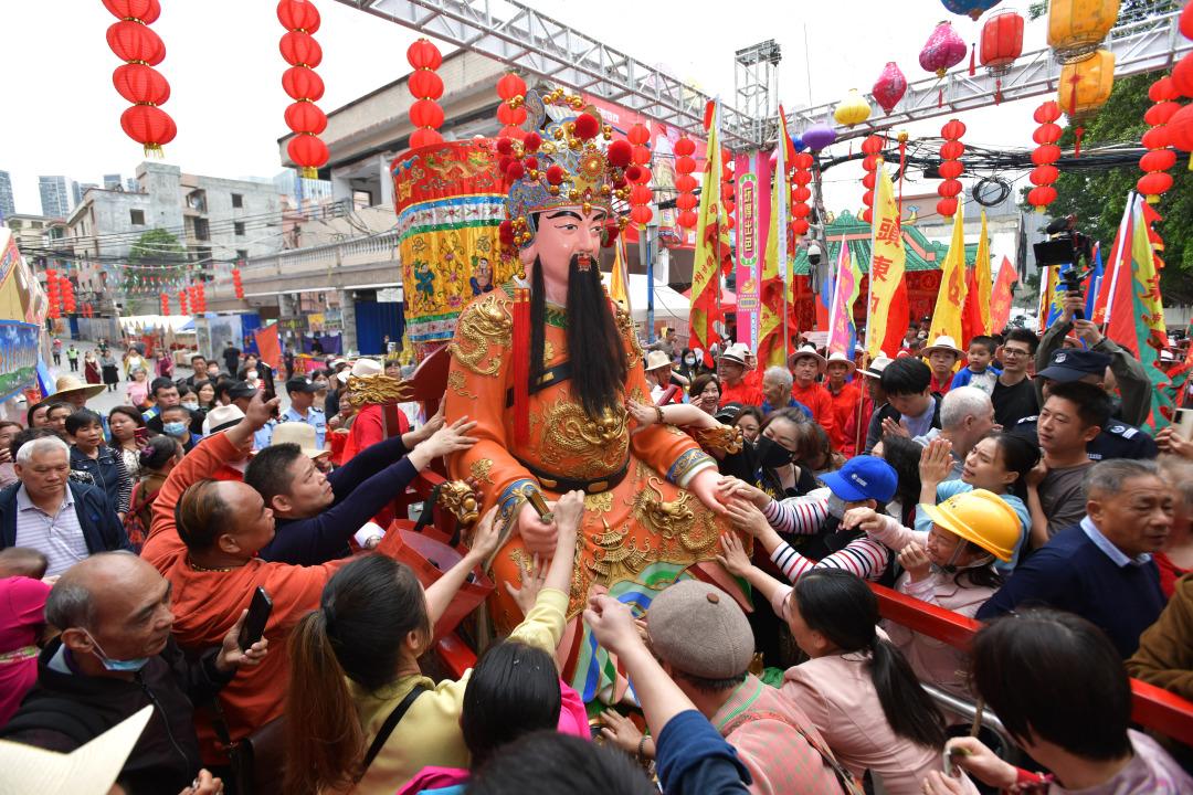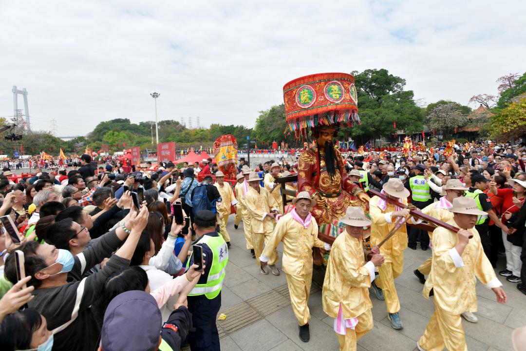 3月12日,2025年广州黄埔“波罗诞”千年庙会迎来正诞日,重头戏“五子朝王”与“龙舟朝王”等传统民俗活动轮番上演。