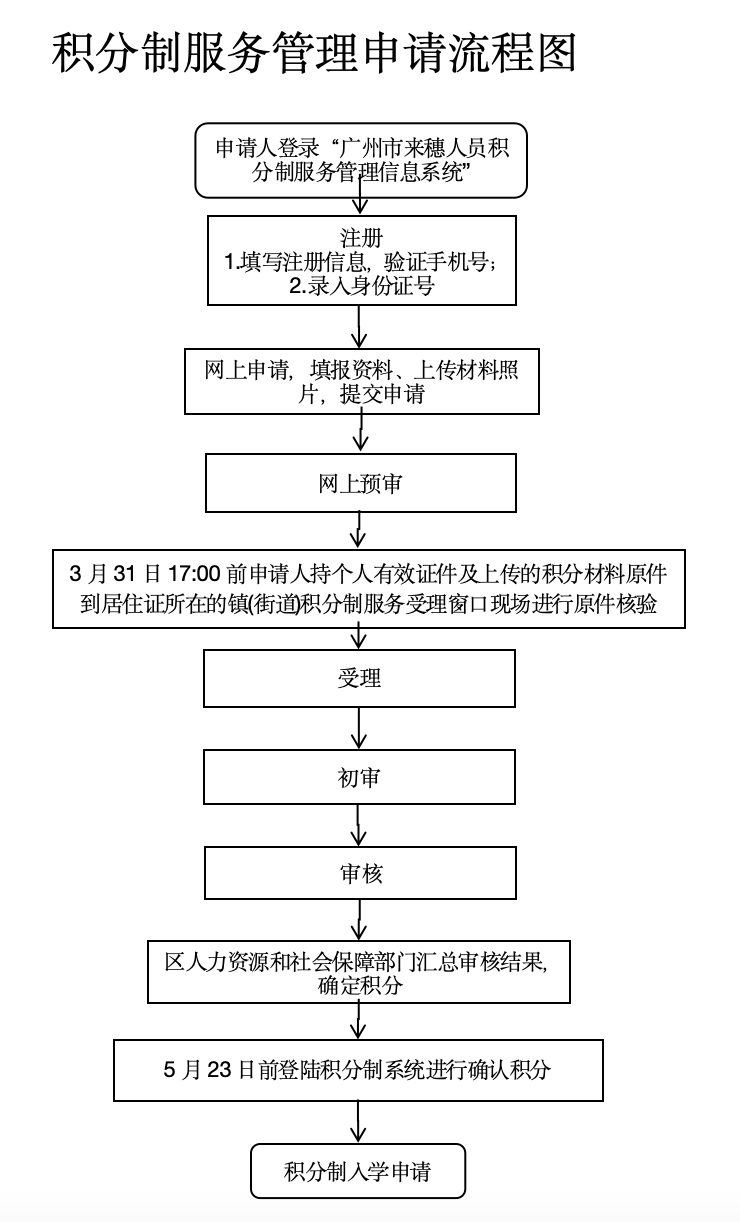 申请时间上,报名参加南沙区2025年义务教育阶段起始年级积分制入学的申请人,需依据规定,通过“广州市来穗人员积分制服务管理信息系统”提出积分制申请或积分调整申请。在收到预审通过通知短信后,务必于2025年3月31日17:00前,携带纸质资料前往居住证申办所在镇(街)积分制受理窗口核验。南沙区积分制受理窗口地点、咨询电话及办公时间可查阅“南沙区积分制服务管理受理窗口一览表”。