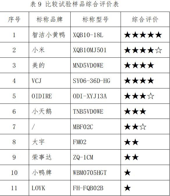 此次实验根据每项评星洗净性能(20%)、脱水性能(20%)、噪声(10%)、高温煮洗温度(10%)、蓝光除菌强度(10%)、操作便利性(10%)、功能多样性(10%)、零部件和材质评价(10%)占比得到综合评星,综合评星排名前五的分别是:智洁小黄鸭、小米、美的、VCJ和OIDIRE。