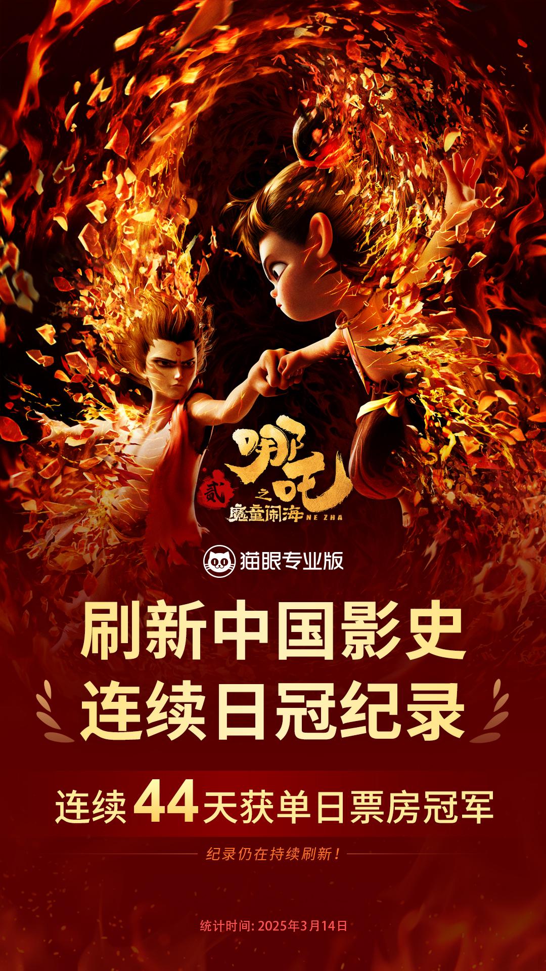 据网络平台数据,《哪吒之魔童闹海》(《哪吒2》)连续44天获得单日票房榜冠军,刷新中国影史连续日冠纪录!