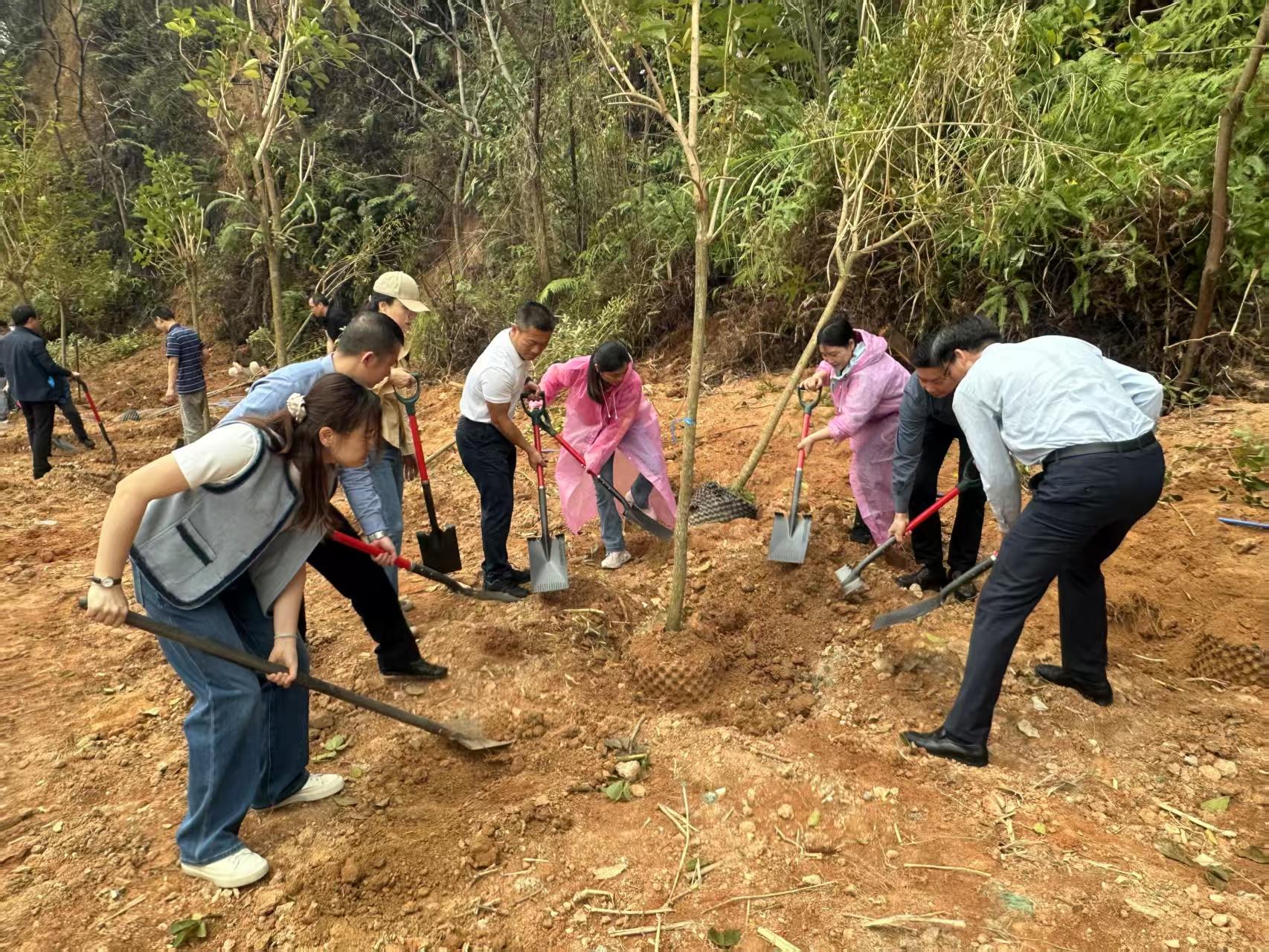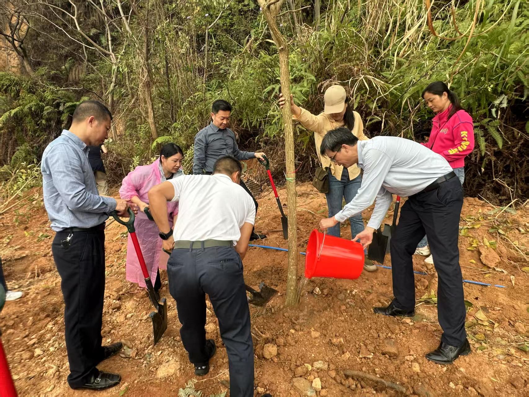 当天,大源洞水库内树木葱郁、鸟语花香。省人大代表贺冬贵,市人大代表曾丽晴,区人大代表何安良、郭军、范慧珍、申珅、谭锐樟、罗桂萍等踊跃参与,分工明确,有的挥锹铲土,有的扶苗填坑,有的提桶浇水,每一个环节都认真细致、一丝不苟。