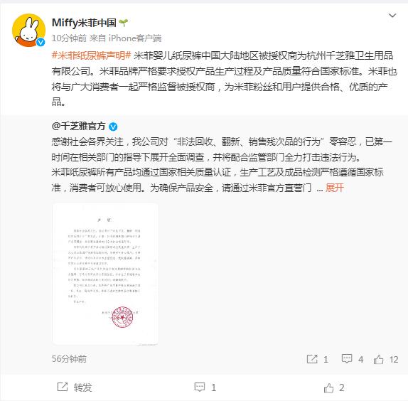 3月16日,Miffy米菲中国、千芝雅官方微博回应3·15晚会曝光翻新卫生巾及婴儿纸尿裤乱象。