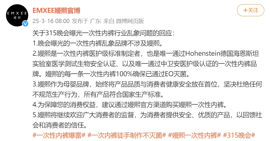 3月16日,嫚熙微博发布关于3·15晚会曝光一次性内裤行业乱象问题的回应: