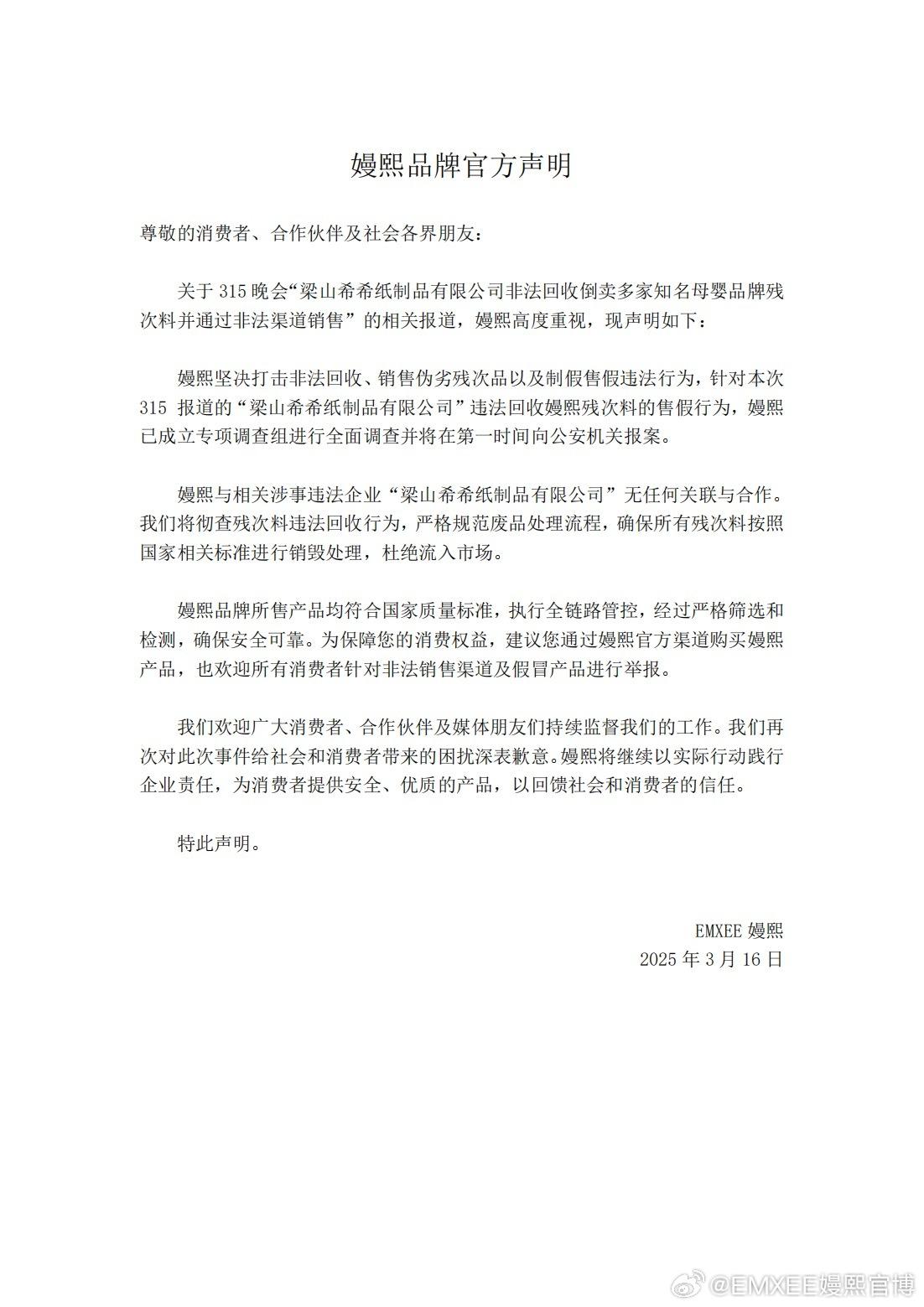 3月16日,嫚熙发布声明,称针对本次315报道的“梁山希希纸制品有限公司”违法回收嫚熙残次料的售假行为,嫚熙已成立专项调查组进行全面调查并将在第一时间向公安机关报案。