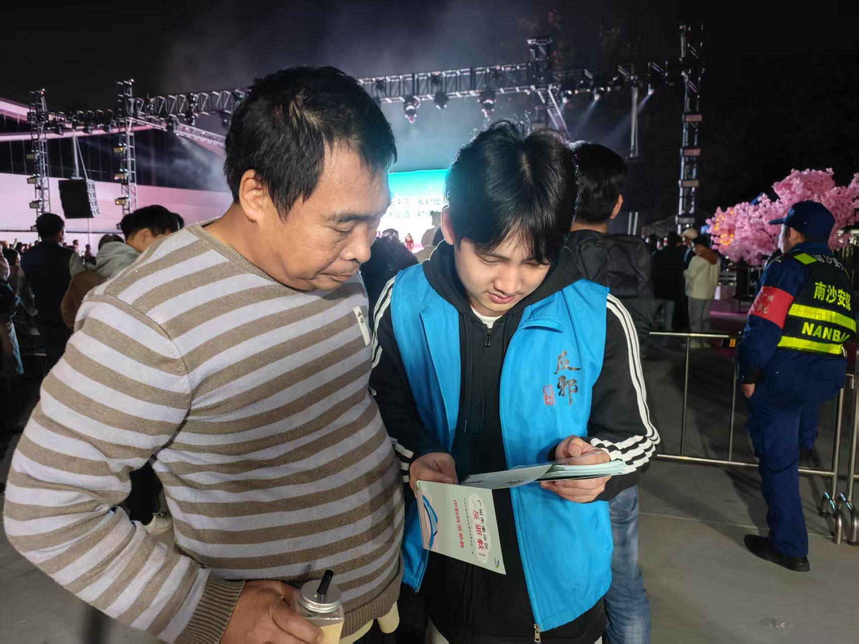 志愿者走进赏樱花队伍中派发资料,共筑平安大岗。
