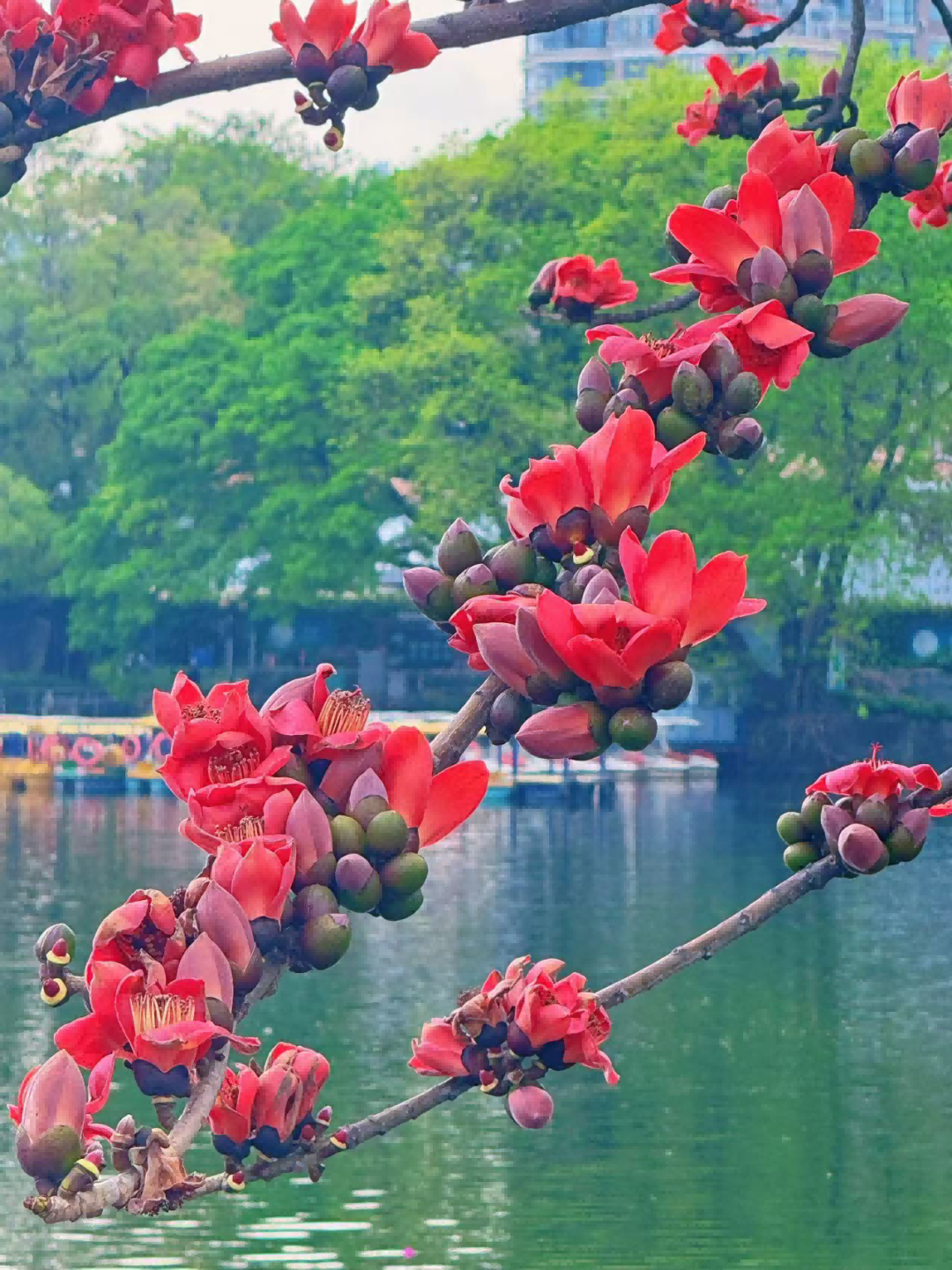 东山湖公园作为城市中的一片绿洲,每年春季都会吸引大量游客前来赏花。时下,东山湖公园木棉花开得格外灿烂,园区内一棵棵木棉树上上挂满了火红的花朵,仿佛一片片燃烧的火焰,照亮了整个公园。在太阳照耀下,一簇簇木棉花随风摇曳,展现出春光明媚的画面。