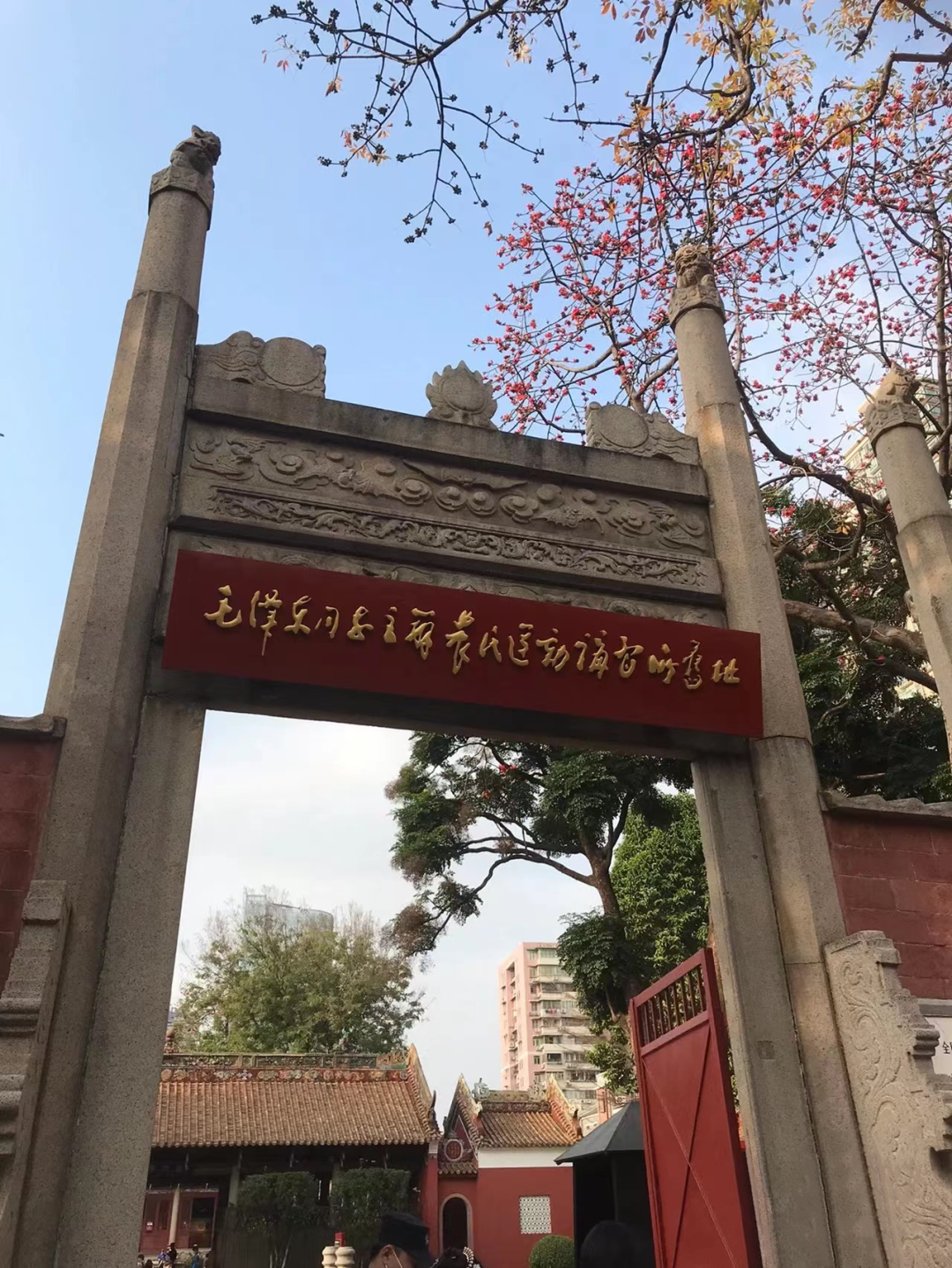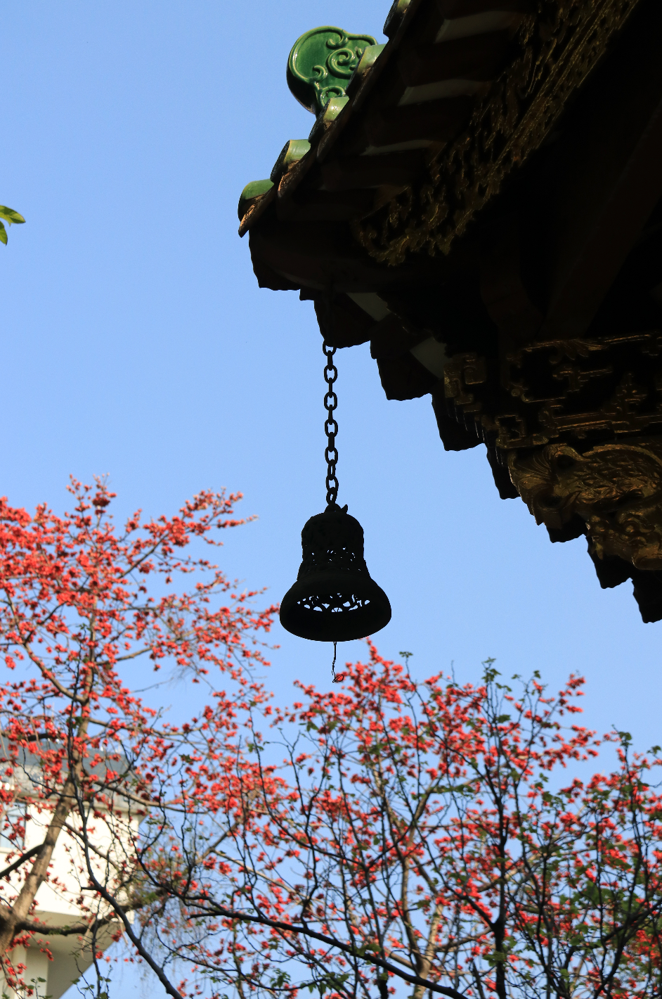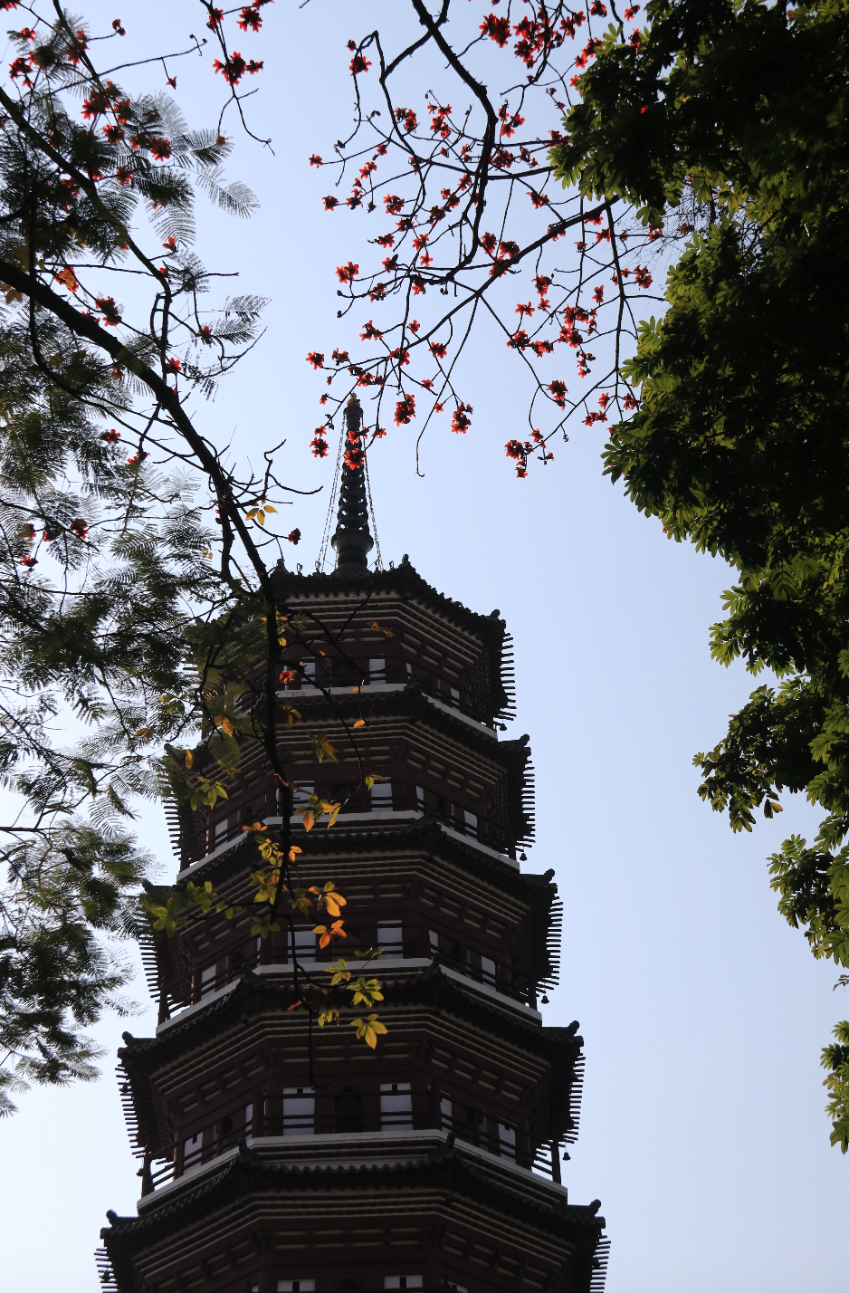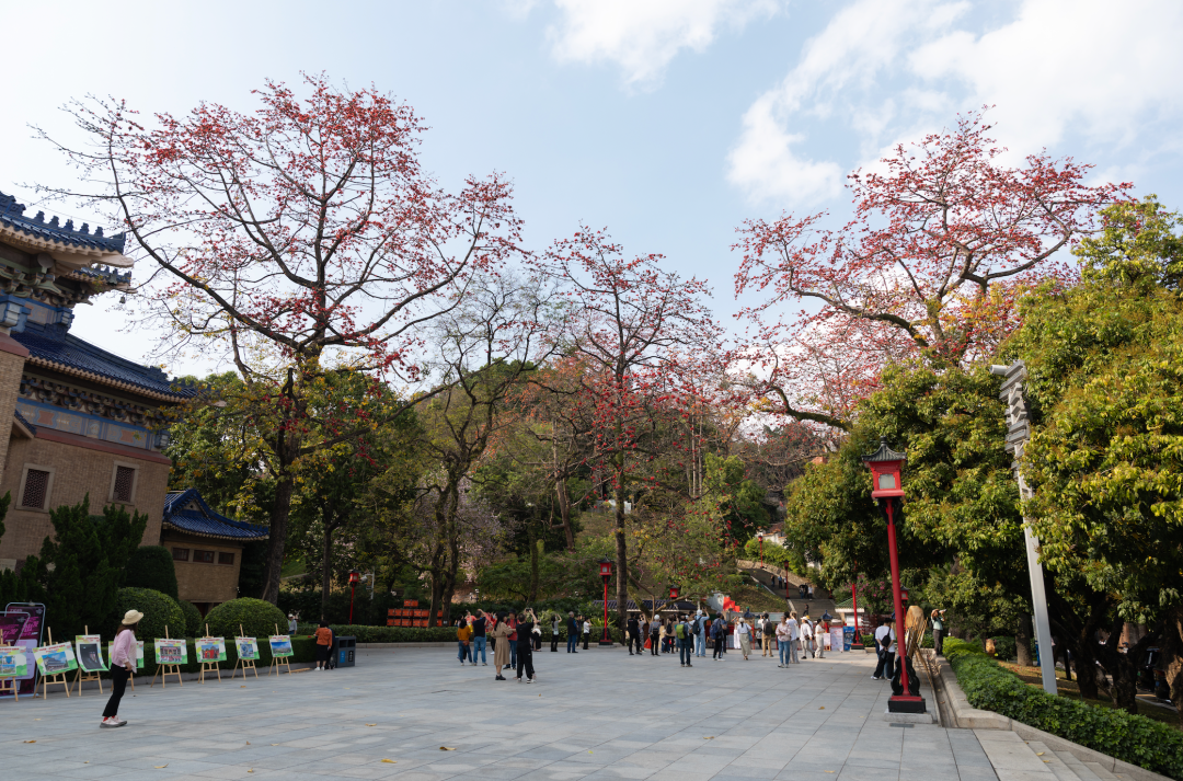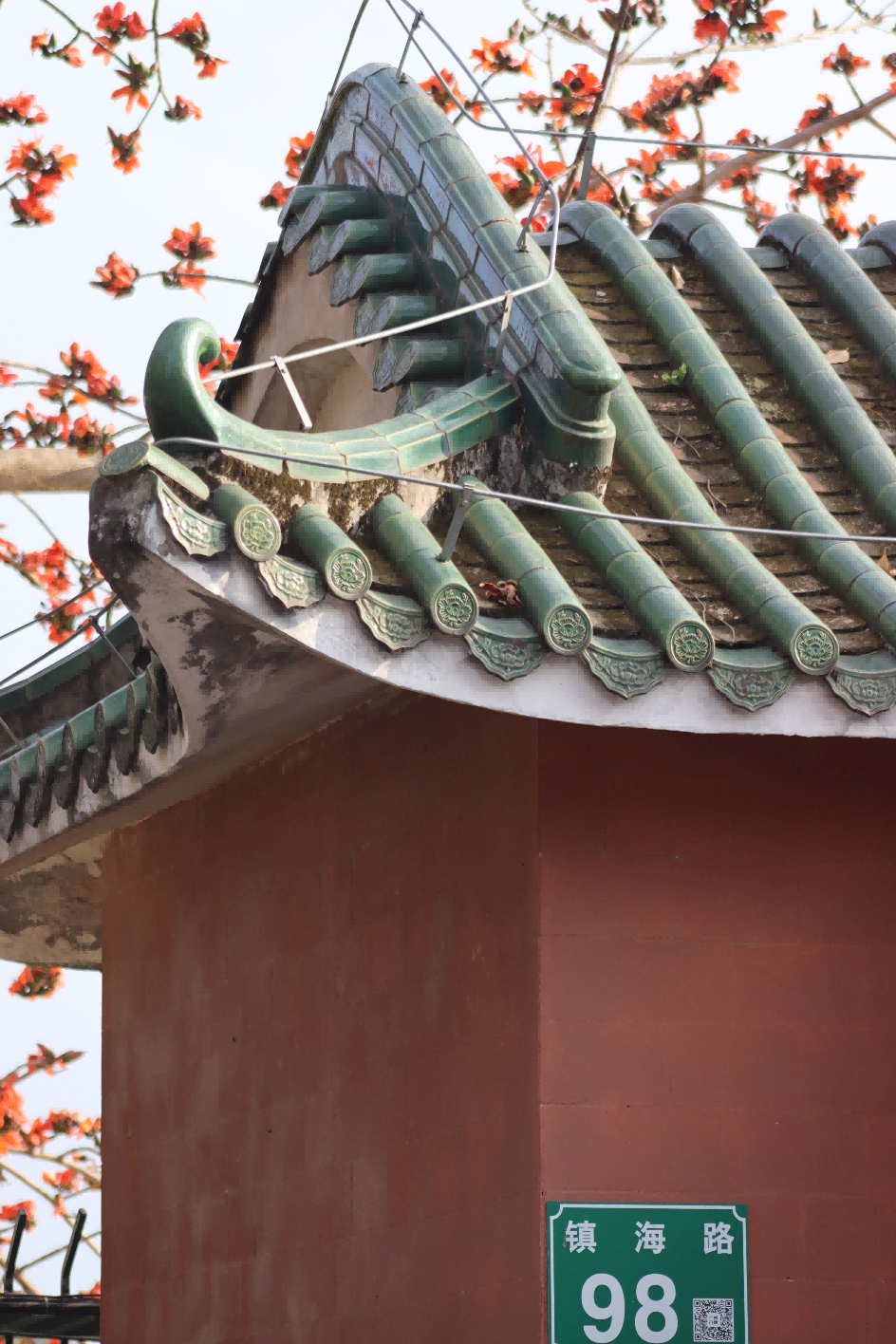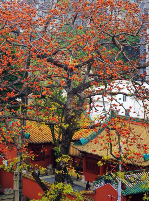古香古色的六榕寺,位于六榕路,因北宋诗人苏东坡题字而得名,承载着一千五百多年的历史与文化,是全国重点文物保护单位。其周边及寺内的木棉已全然盛开,火红如炬的花瓣与古寺的青砖黛瓦相互映衬。微风拂过,花瓣随风飘落,绿色的瓦面上点缀着星星点点的红色,如同披上了一层绚丽的花毯,让人不禁驻足欣赏。
