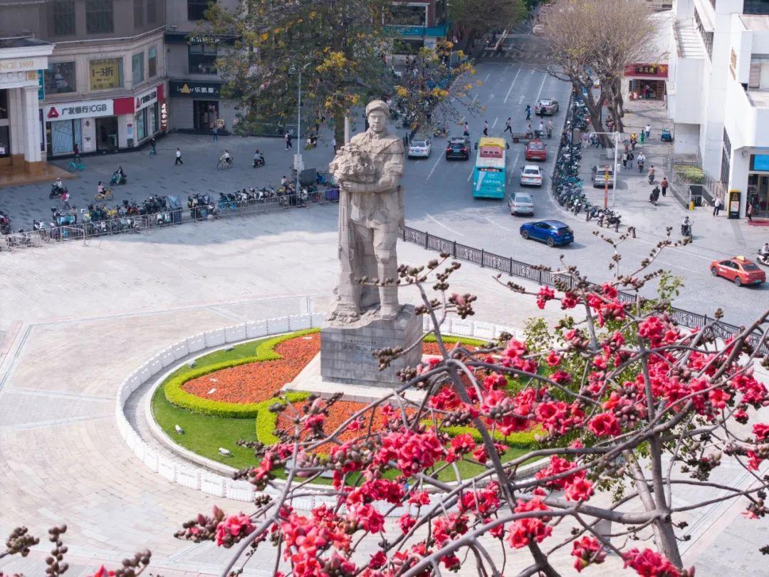 海珠广场建于1953年,位于广州市传统中轴线与滨江景观带的交点,是广州第一座城市滨江广场。在阳光的照耀下,海珠广场上空那一簇簇开得热烈的木棉花红似火,与矗立在海珠广场中央的广州解放纪念像相互映衬,它们似乎在生动讲述着“英雄花开英雄城”的故事,诠释着这座城市的历史与精神。