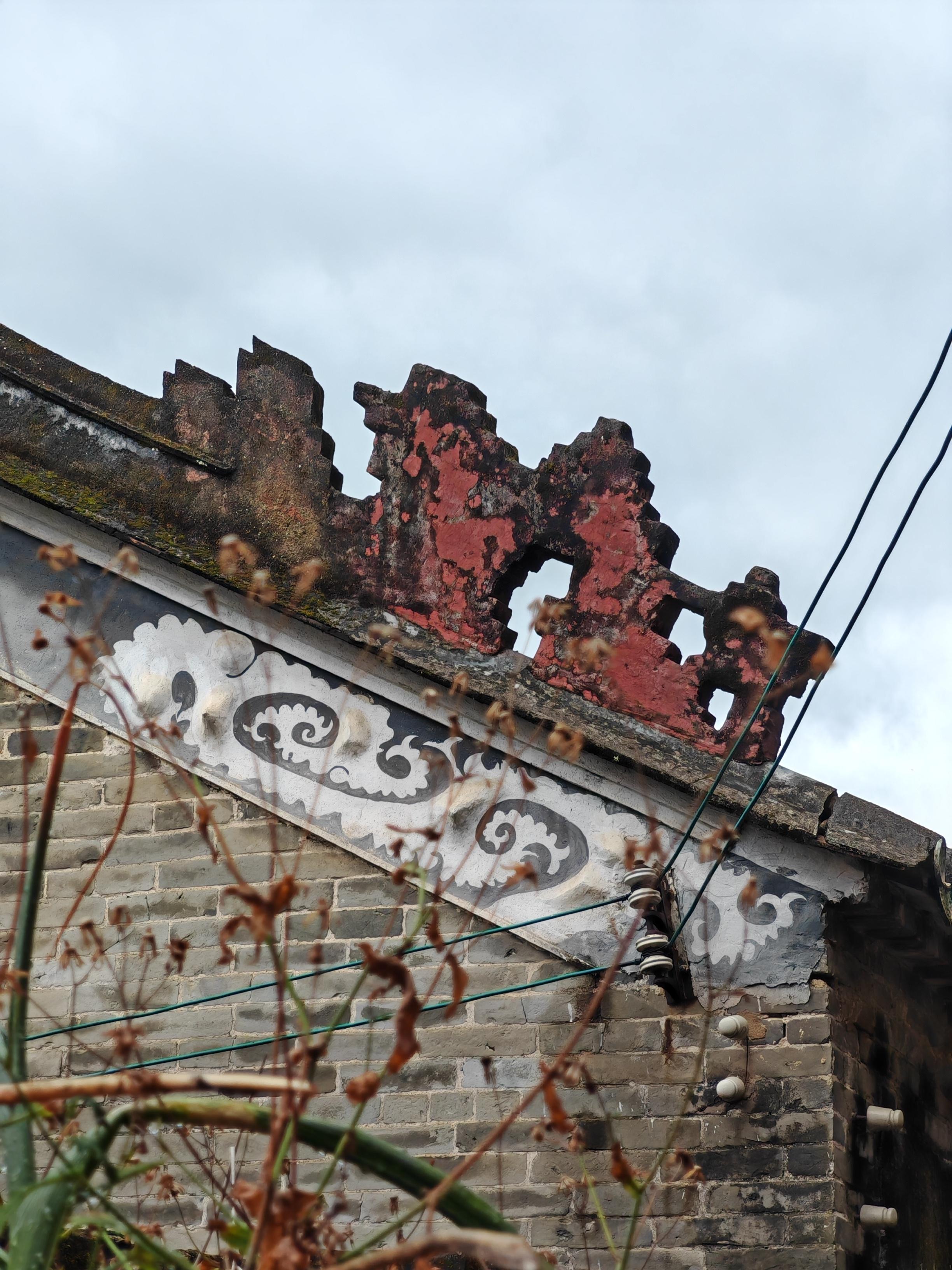 除了天后古庙,塘坑村内还有一座上坊天后庙。始建于明代,清代重修,坐北朝南三间二进格局,面阔9.8米、进深13.4米,硬山顶配灰塑博古脊与绿琉璃瓦当,青砖花岗岩基庄重古朴。屋脊灰塑纹饰繁复,石额楷书“天后庙”端方大气,为南沙清代庙宇典范。庙前木藤游龙盘踞门檐,鳞爪飞扬,为古庙平添几分灵动生气。