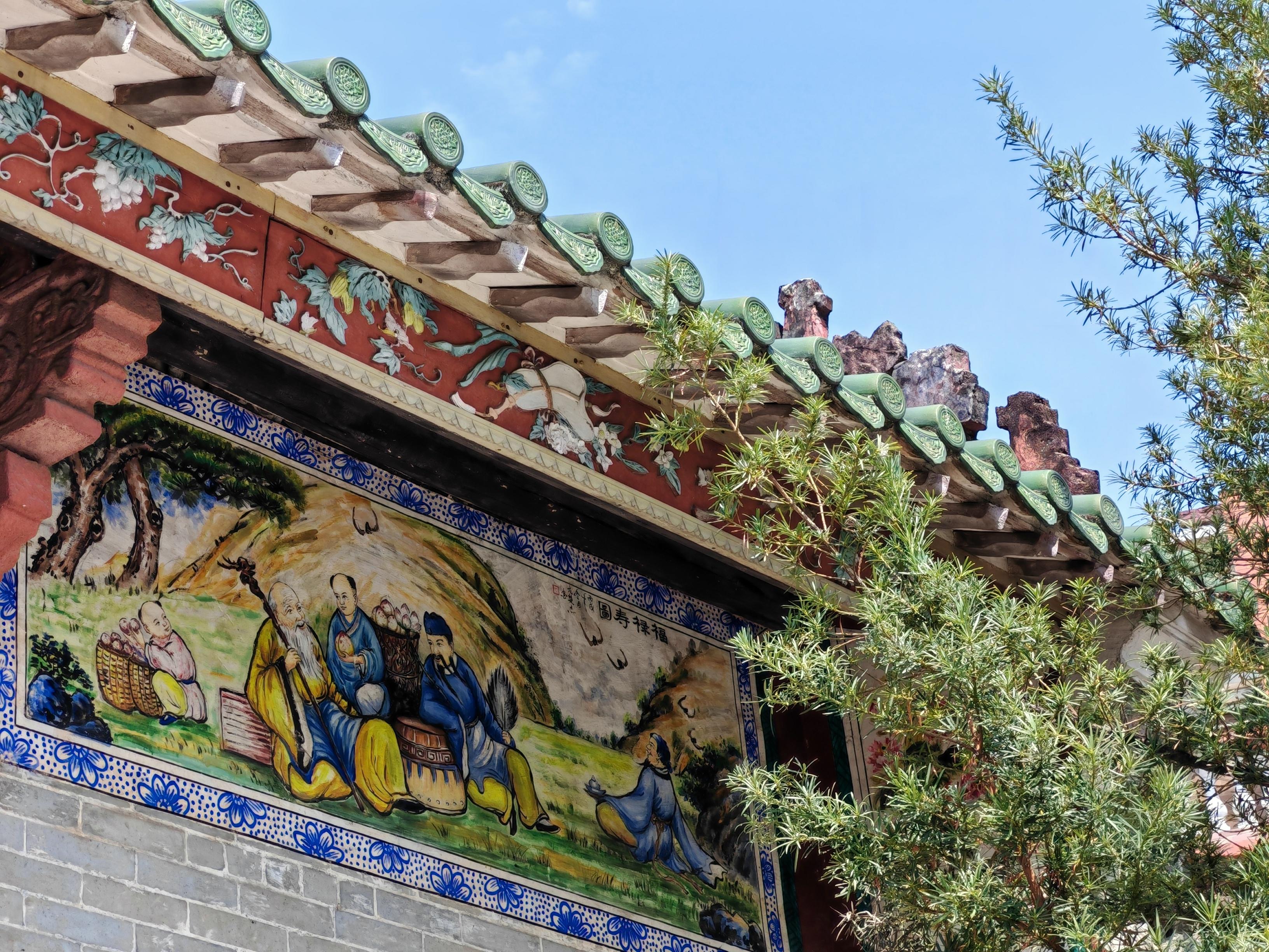 古庙坐西北朝东南,两进硬山顶建筑保留了清代形制:绿琉璃瓦当滴水剪边,花岗岩石脚沉稳如山,后殿独特的蚝壳墙更显滨海智慧。门额“天后古庙”四字苍劲有力,两侧楹联“虎海普慈航万顷波澜永奠,凤山隆肸蚃千秋俎豆常新”,道尽先民对海洋的敬畏与感恩。庙内嘉庆年间的重修碑刻,更是研究珠江口民俗与气候的珍贵史料。