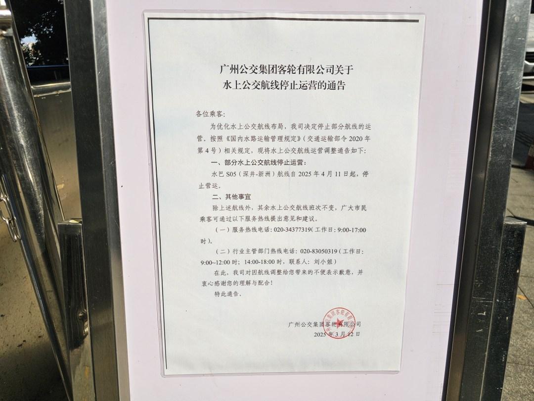 日前,广州公交集团客轮有限公司发布关于水上公交航线停止运营的通告。其中提到,为优化水上公交航线布局,水巴S05(深井-新洲)航线自2025年4月11日起停止营运。