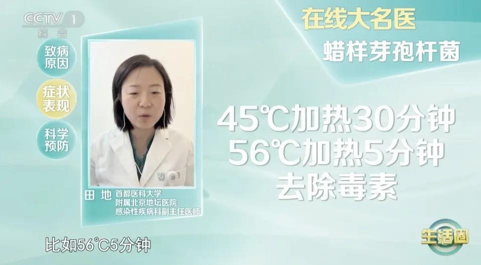 蜡样芽孢杆菌产生的腹泻型肠毒素,45℃加热30分钟,56℃加热5分钟,可以去除毒素。
