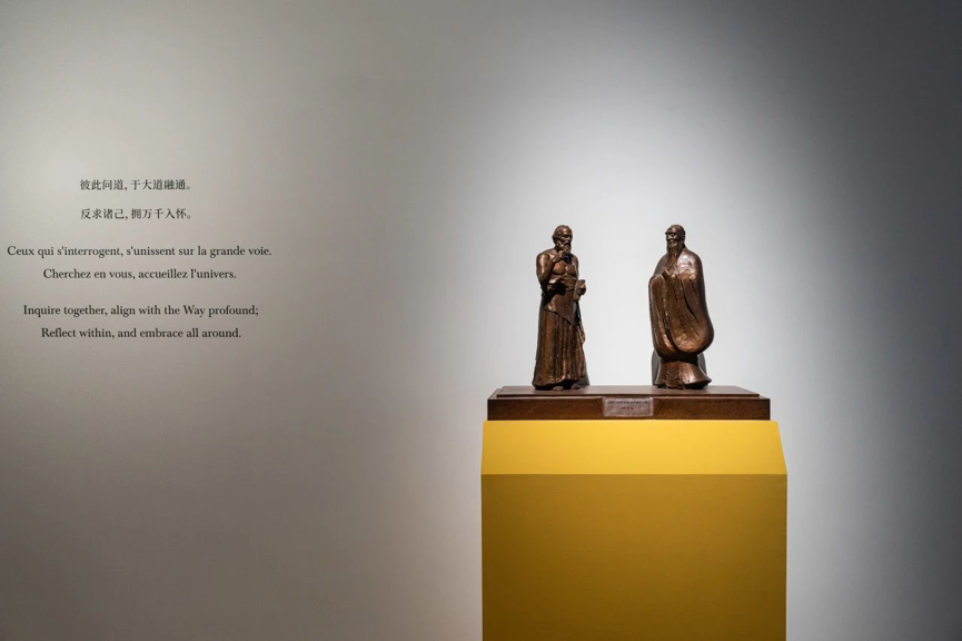 本次展览呈现了吴为山的多件重要作品,包括写意手法讲述孔子适周问道于老子故事的组雕《问道》,以及寓意东西方文明不可分割、平衡共生的《在一条船上——达·芬奇与齐白石的神遇》《神遇——孔子与苏格拉底的对话》等。这些作品展现了东西方文化跨越时空的交流互鉴,体现了吴为山先生对人类文明共同体理念的艺术探索。