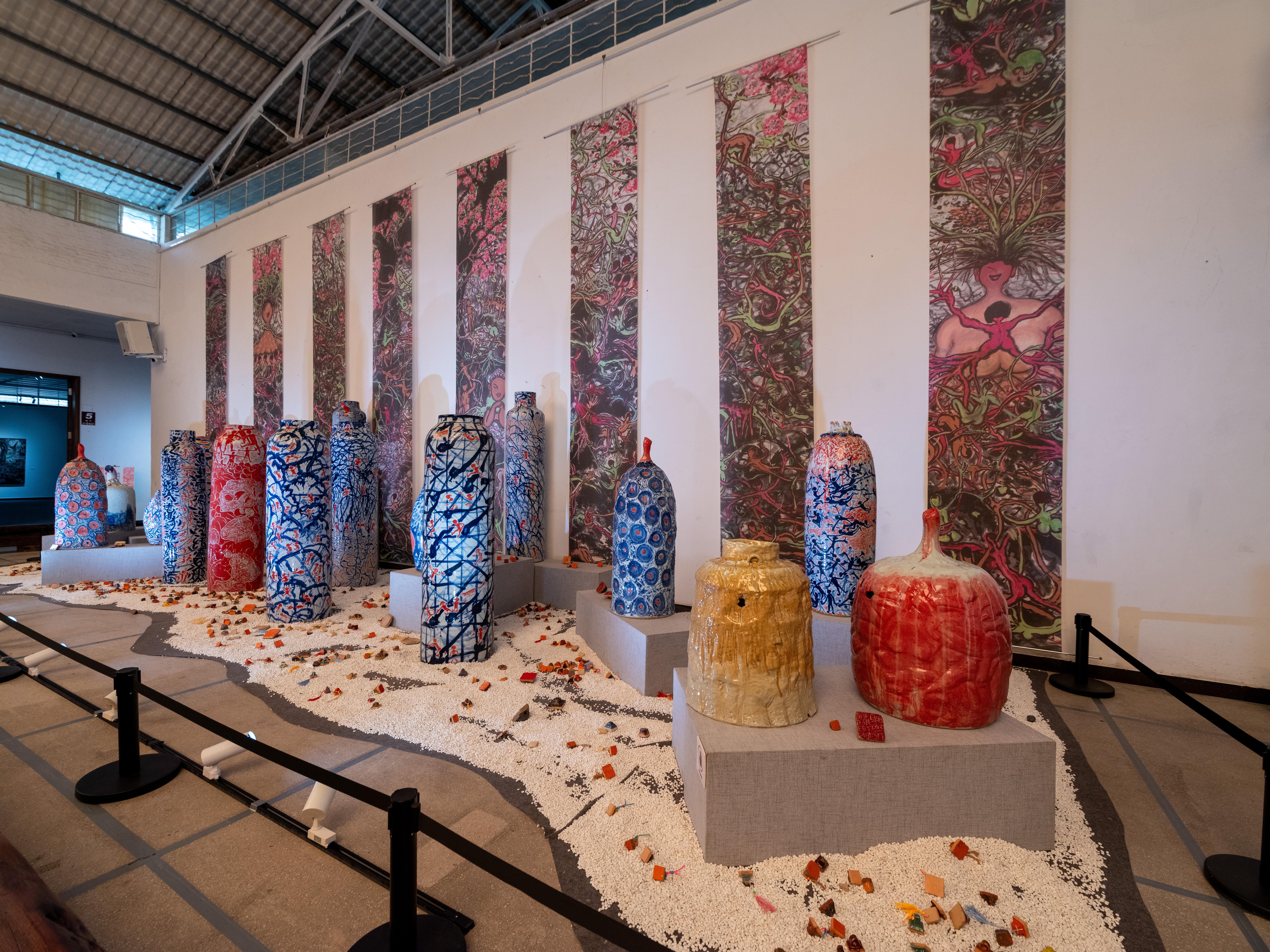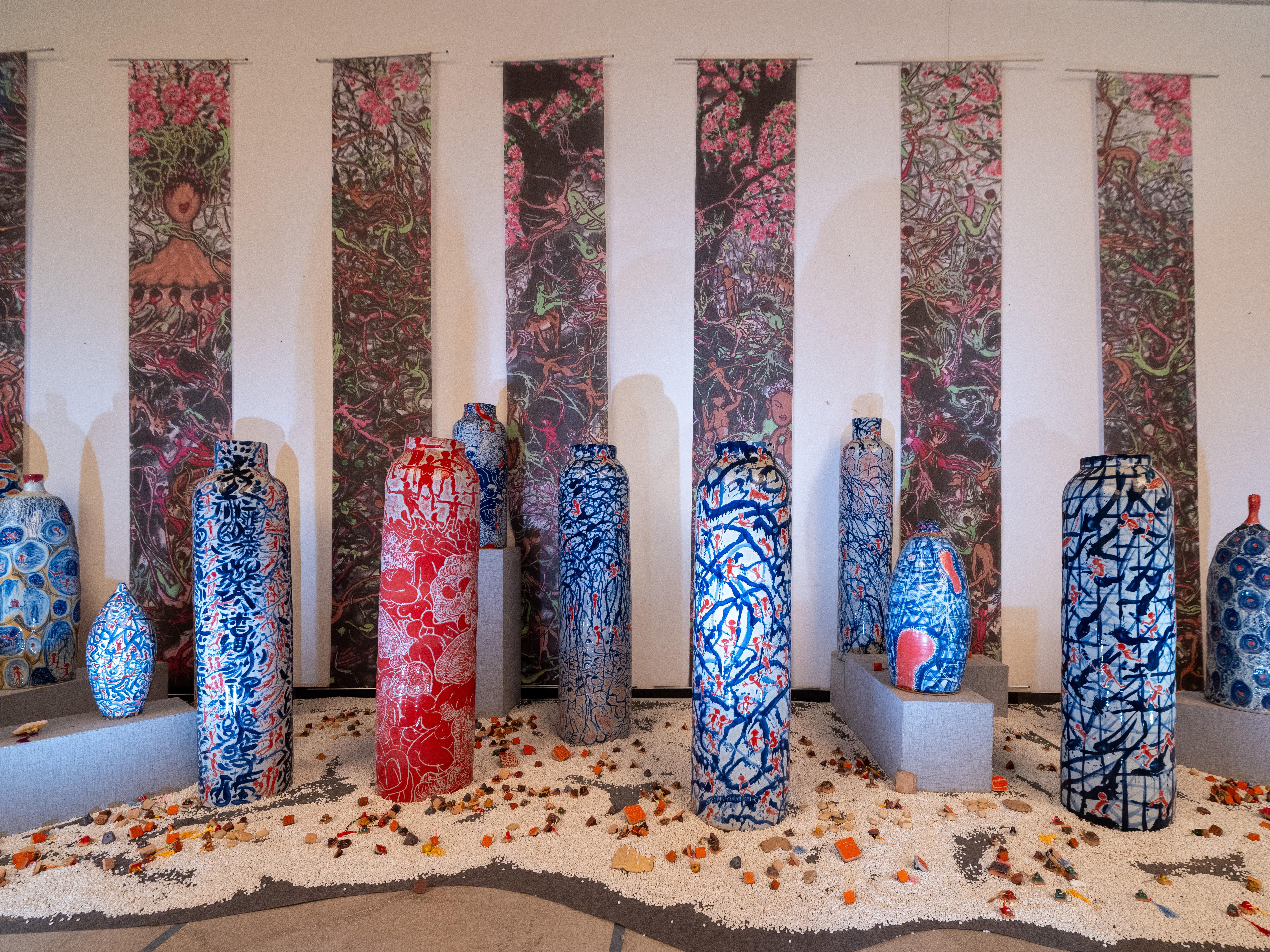 展览中重点展出一组艺术家在2020年于景德镇精心创作、以“消息树·生命风景线”为主题的大型陶瓷系列作品。艺术家将冰冷的弹壳和弹头,做成了有温度的巨型陶瓷艺术作品,表达了作者对人类文明进程中出现问题的深刻反思和"化戈为艺"的和平价值观。