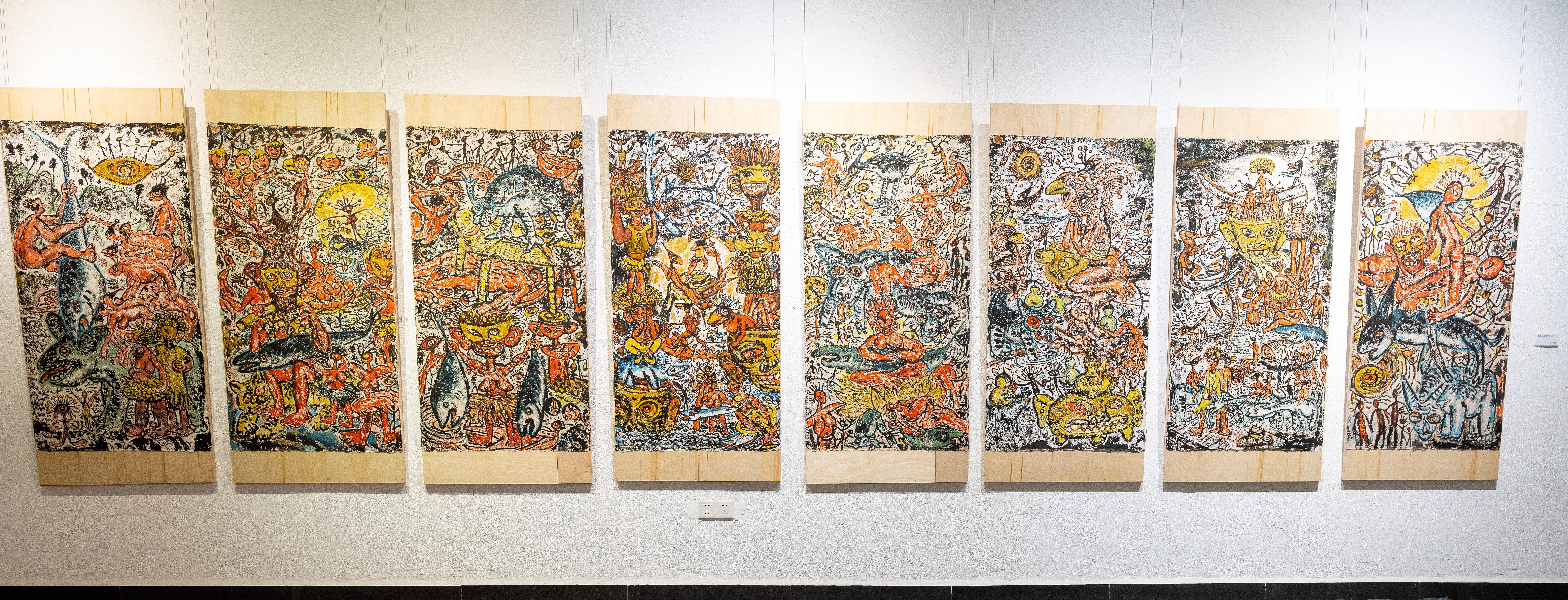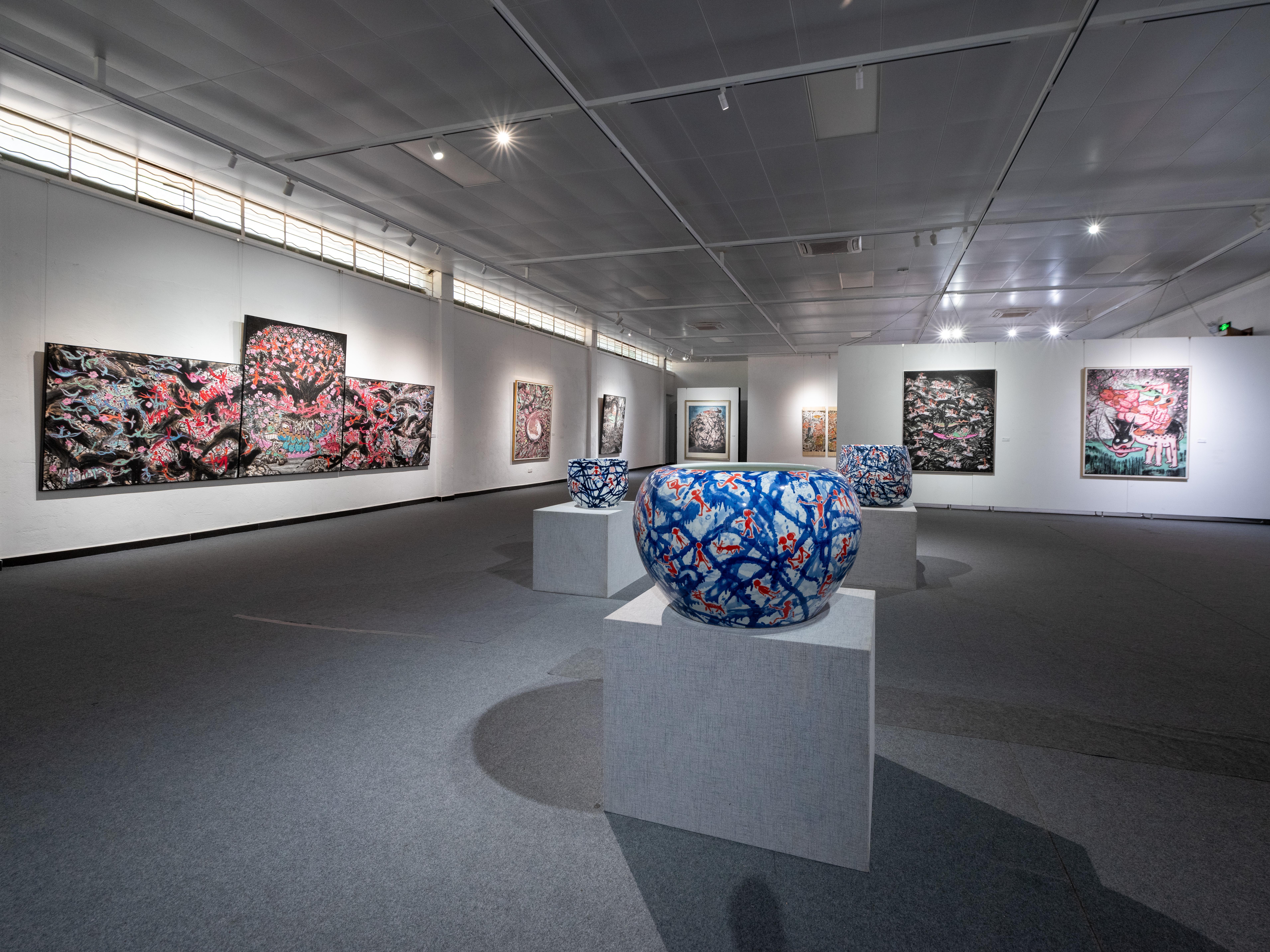 他还有众多融入楚文化浪漫奇谲与神秘元素的大幅画作,有现代、后现代式的不羁。他最新的创作则以艺术家的视角“凑”了三星堆的热度,对史前的青铜纹样进行解构,植入民间彩绘乃至街头涂鸦元素,转换为新颖锐利的后现代符号。