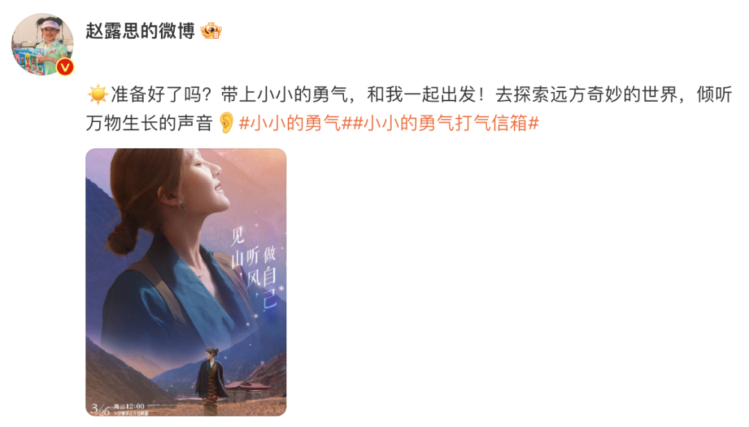 启程之前,赵露思发博邀请大家一起见证这次出发。此次由小小“勇气”承载的出发让不少网友表示期待:“和赵露思一起治愈自己,并把阳光和勇气带给大家!”“希望我们都能拥有小小的勇气。”“想看赵露思眼中的乡村故事!”