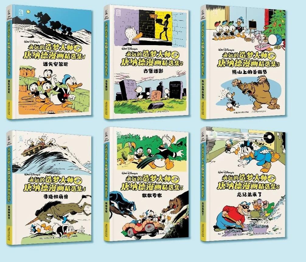 《永远的造梦大师:唐纳德漫画精选集》汇集了这位漫画大师的经典作品,也是唐老鸭形象诞生90周年的中文简体全彩纪念版。一共有六册,分别是:《迷失安第斯》《古堡迷影》《熊山上的圣诞节》《寻迹独角兽》《数数专家》《庀兄弟来了》。