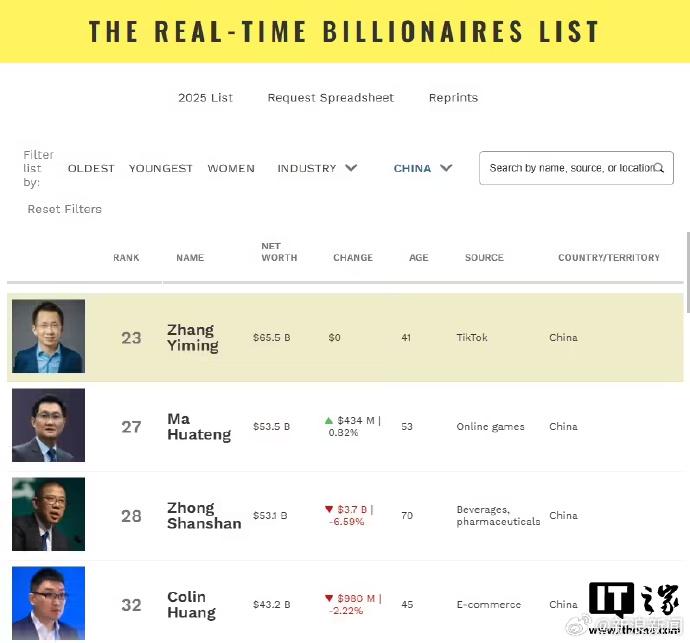 其中,福布斯预估张一鸣身家为655亿美元,在全球富豪榜位列第23位,马化腾与钟睒睒分列富豪榜第27和28位。彭博亿万富豪指数预估张一鸣身家为575亿美元,位居全球富豪榜第24位,马化腾和钟睒睒分列第25和26位。